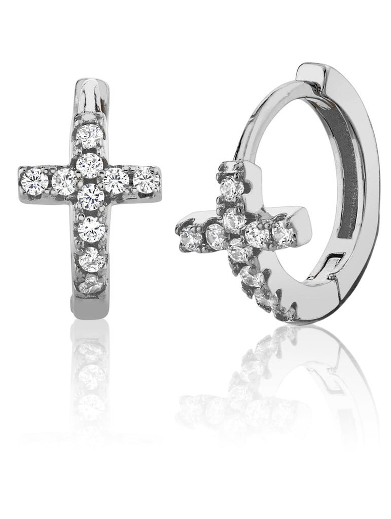 Introducing these lovely, classic Cross hoop earrings. This pair of alluring yet silver cross earrings is finely crafted 925 Sterling Silver, with sparkling clear cubic zirconia stones in a prong-set. For a spiritual heavenly look to any outfit, wear these cross hoop earrings and take your faith wherever you go with you.