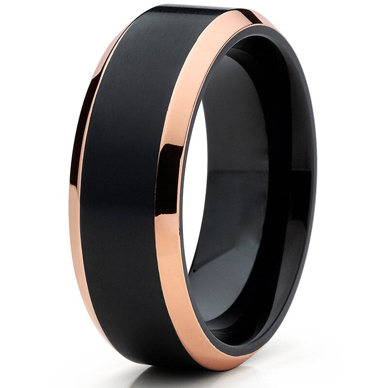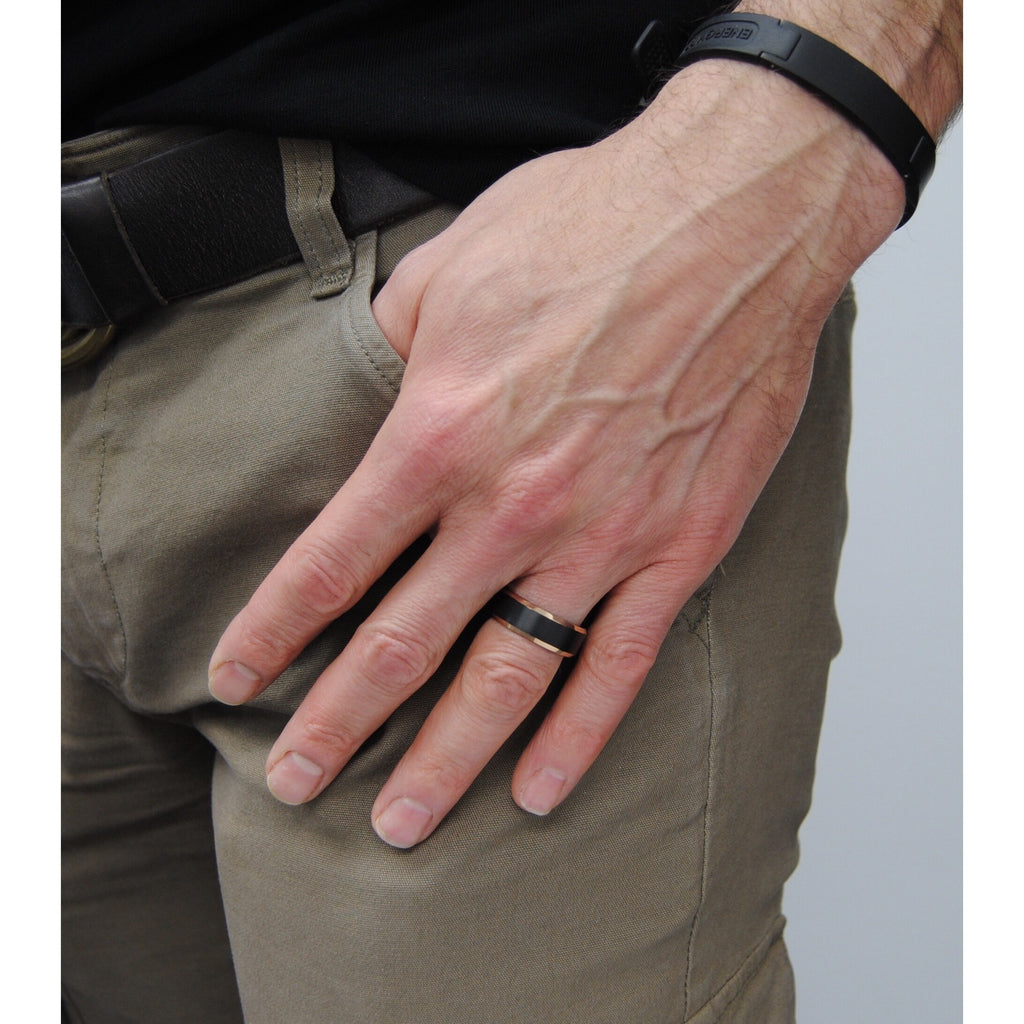 This classy black plated wedding band features a flat top brushed ring with polished rose beveled edges. The ring is constructed of light weight durable titanium metal. Our rings are hypoallergenic.