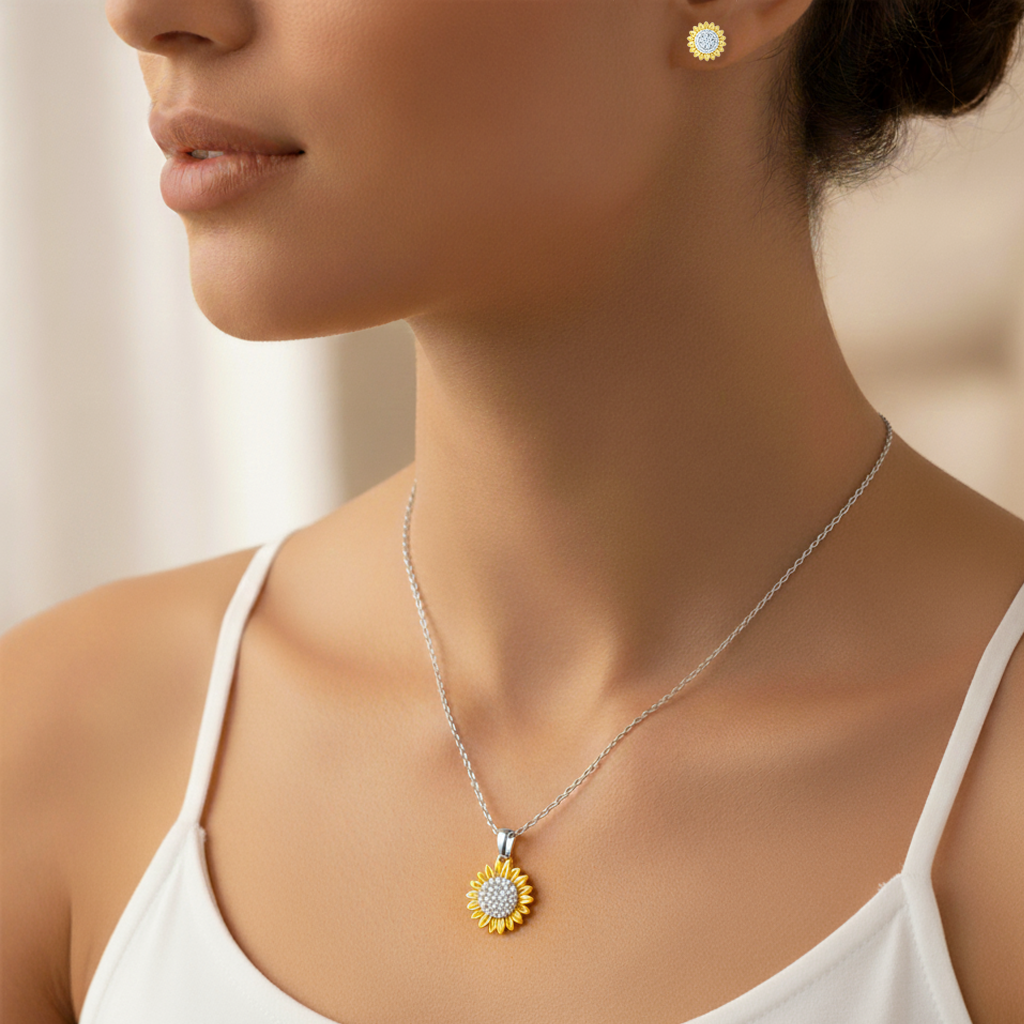 • Premium Two-Tone 925 Sterling Silver Set: Includes a perfectly matched sunflower pendant necklace and stud earrings, featuring durable 14K Gold plating over 925 Sterling Silver for a rich, coordinated look.