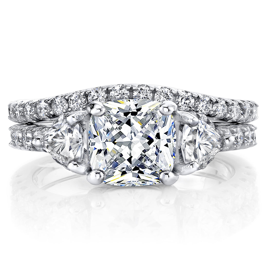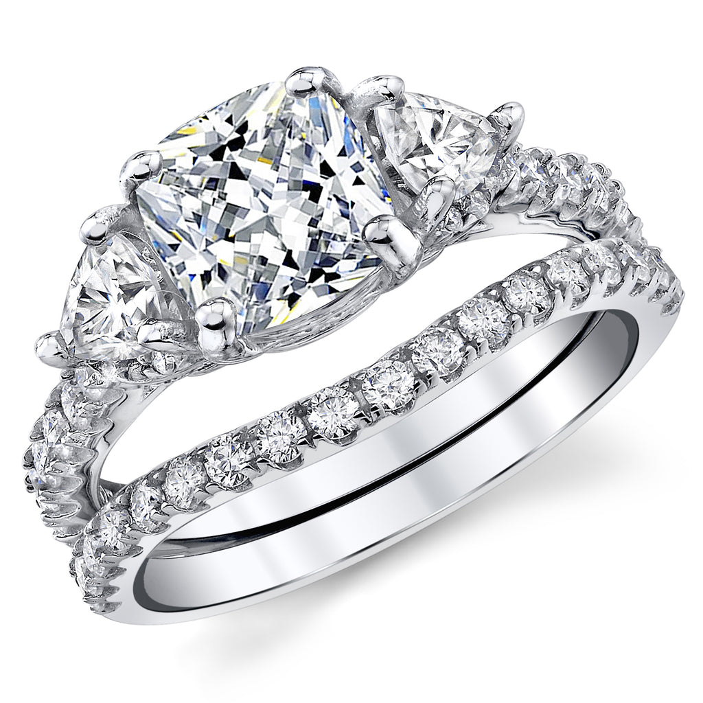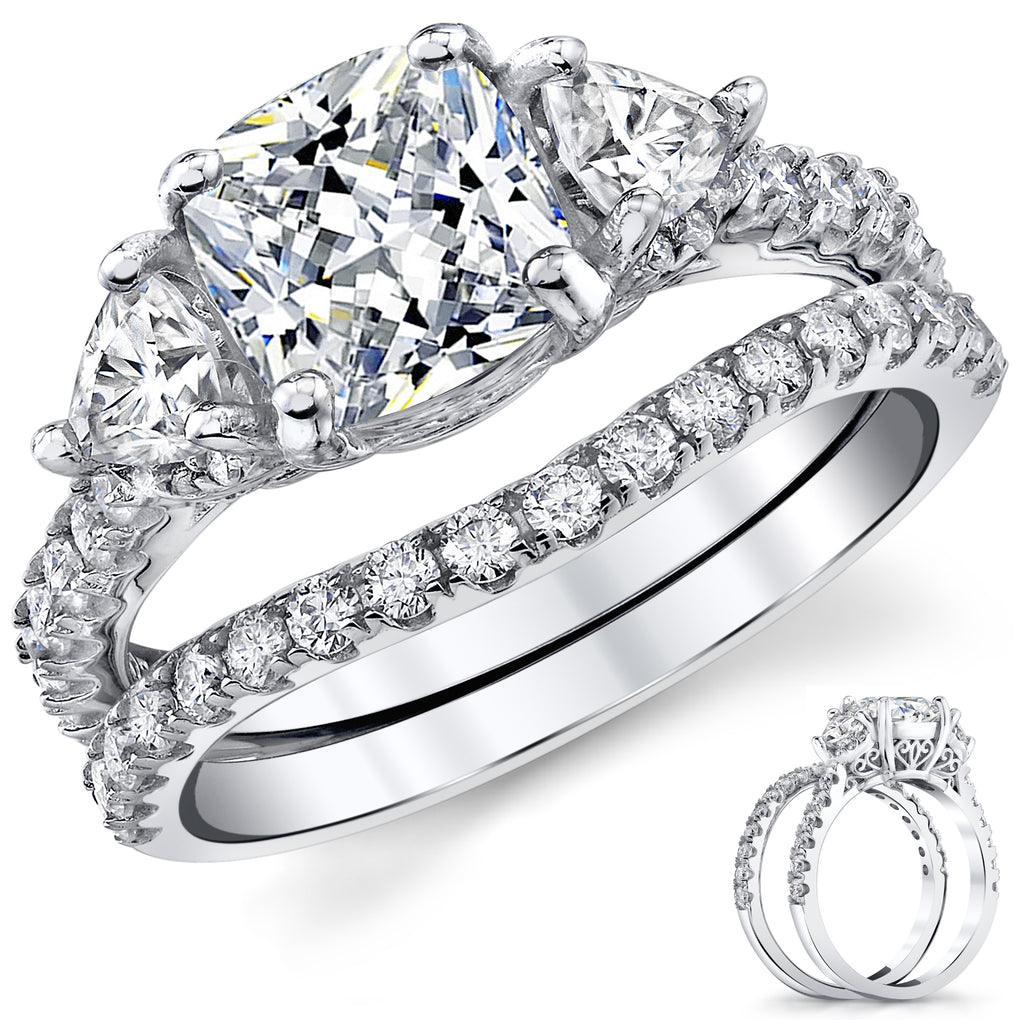 Celebrate your love story with this stunning 2.75Ct Moissanite Trillion Halo Past Present Future Cushion Filigree Wedding Engagement Ring Set. Crafted in 18K White Gold over 925 Sterling Silver, this exquisite bridal set showcases a 2 carat cushion-cut D color VVS clarity moissanite center stone, certified by GRA, and adorned with 42 additional pave-set moissanite stones. The intricate filigree design adds timeless elegance, making this ring set a perfect symbol of your forever love. With a total carat weight of 2.75 carats, this bridal set comes in a complimentary jewelry gift box.