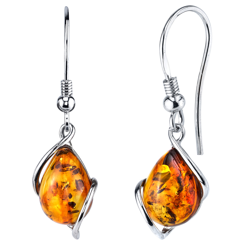 Two piece sterling silver drop earrings with pear shaped rich cognac color genuine Baltic Amber. Earrings are secured with fishhook style earrings backs. Makes a perfect gift for Mothers Day, Birthdays, Valentines Day, Graduation, Christmas or just about any occasion.