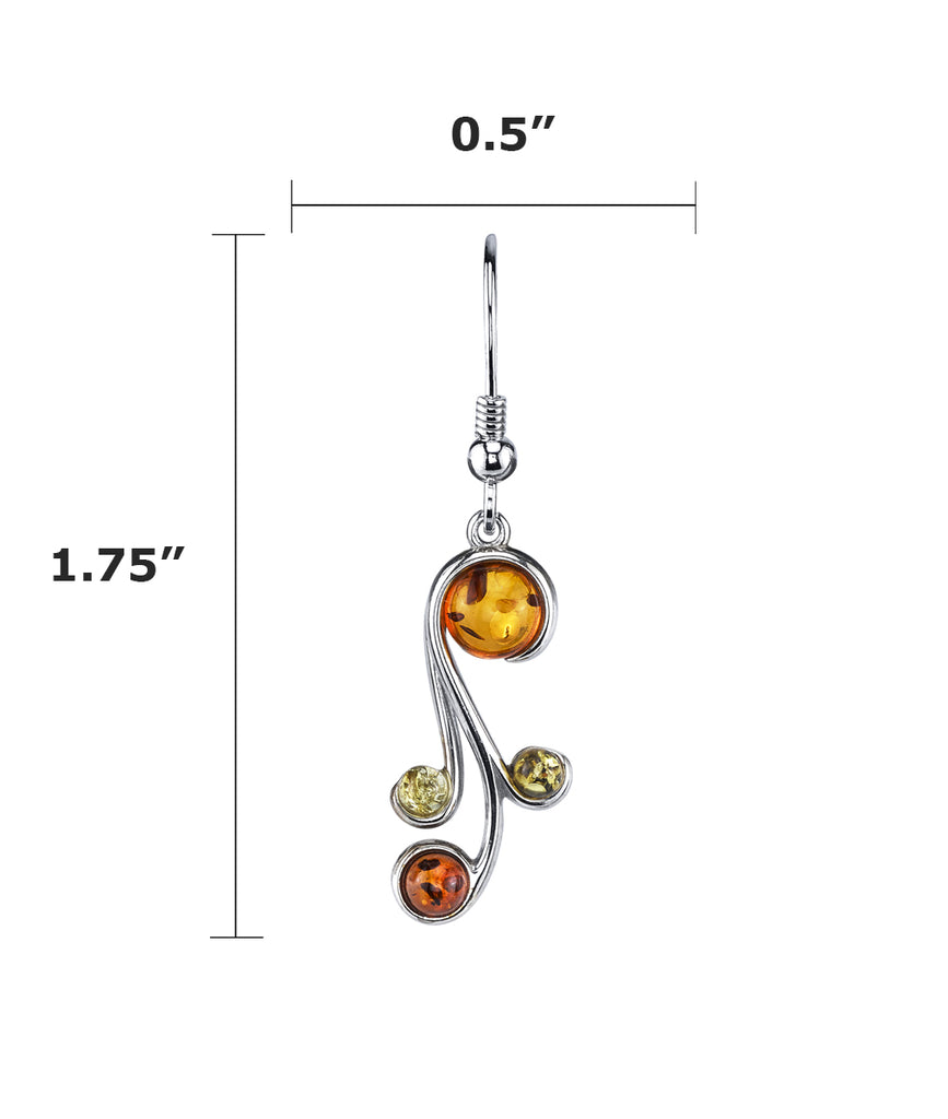 These two piece spiral design drop dangle earrings are finely crafted of sterling silver and gleams with a high polish finish. The earrings are set with 4 multi color honey, olive, cognac and yellow genuine Baltic Amber. ideal gift birthdays, Christmas, Valentines day.