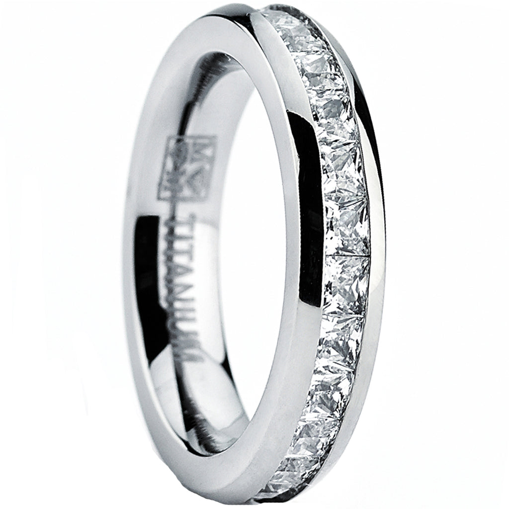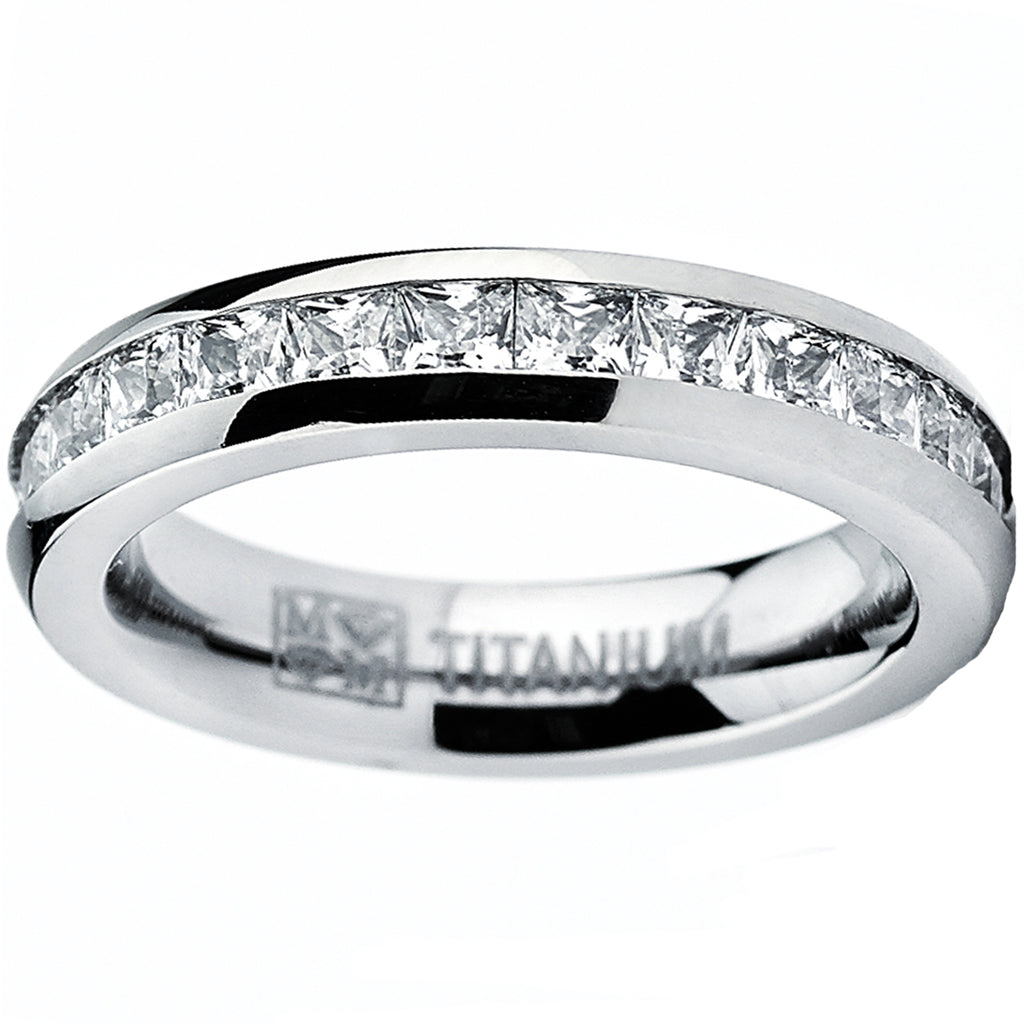 This beautiful ring is 4MM in width and Comfort fit. It is high-polish with channel set Princess Cut Cubic Zirconia going all the way around the ring. Our rings are hypoallergenic.