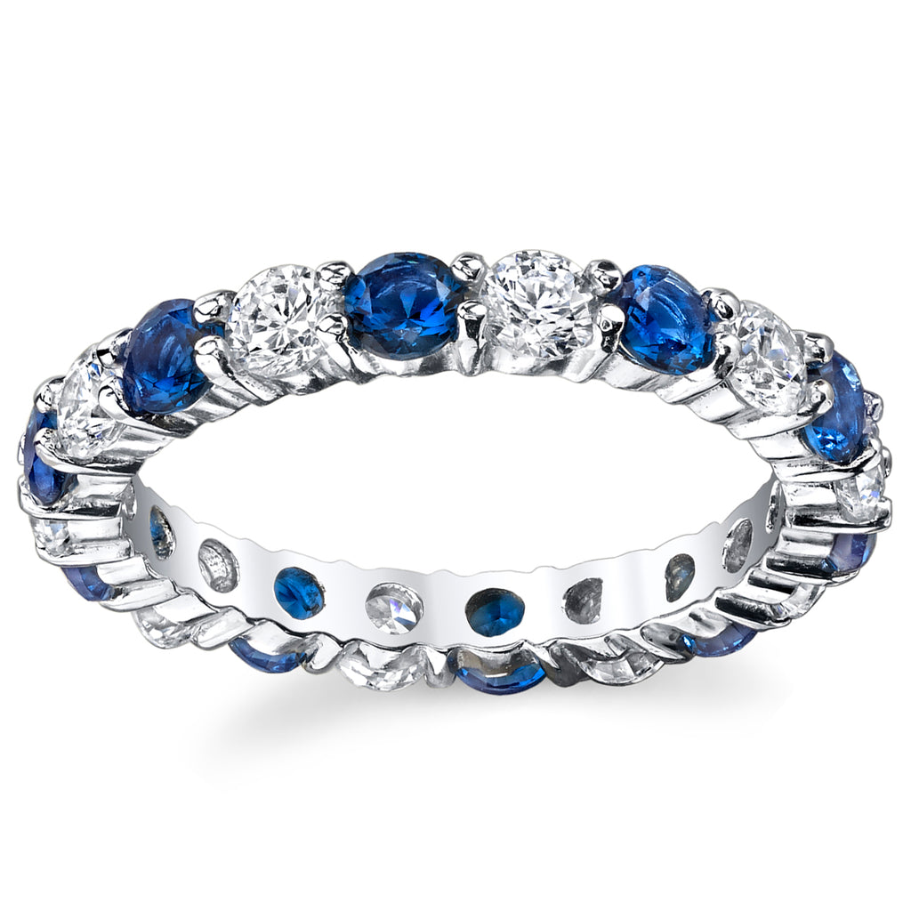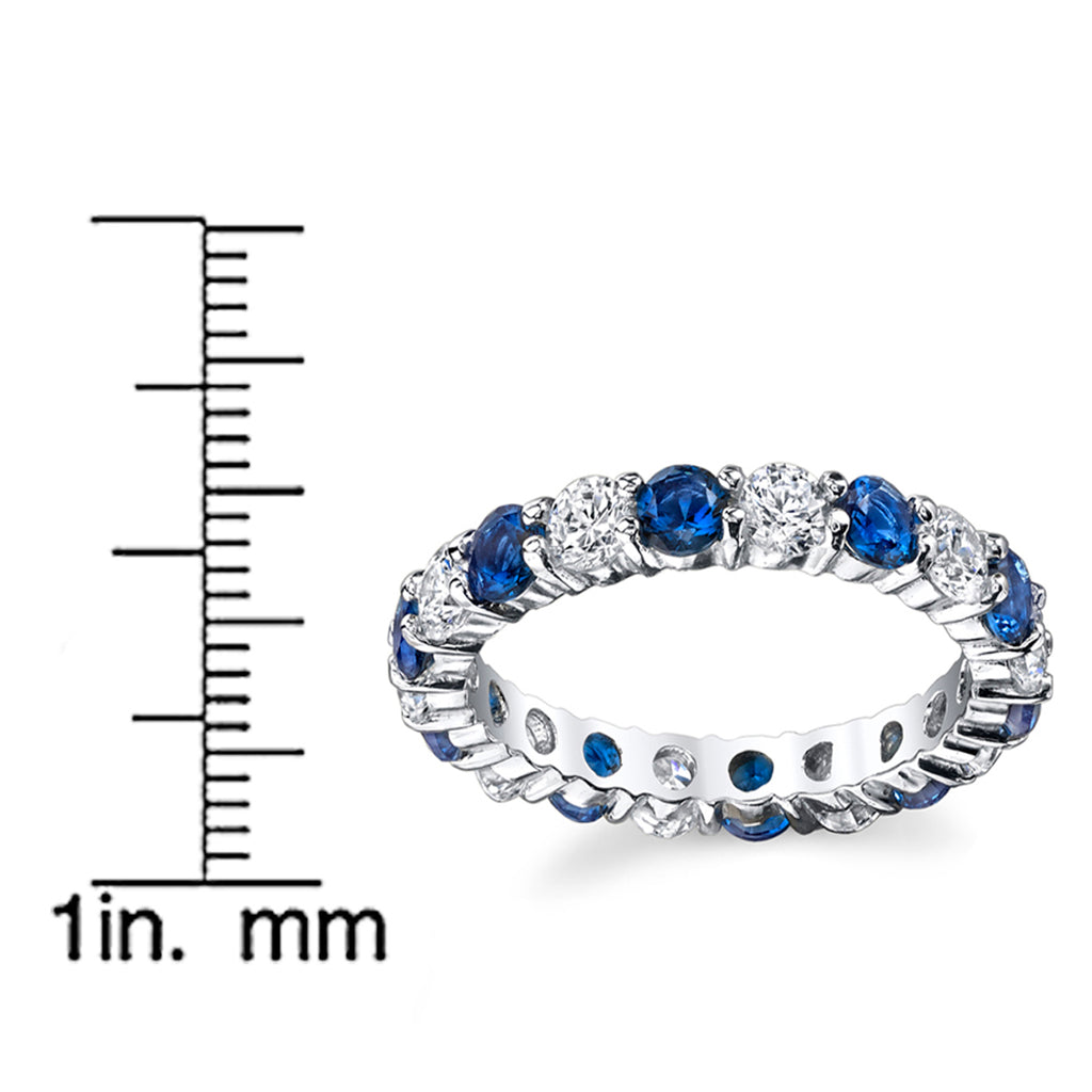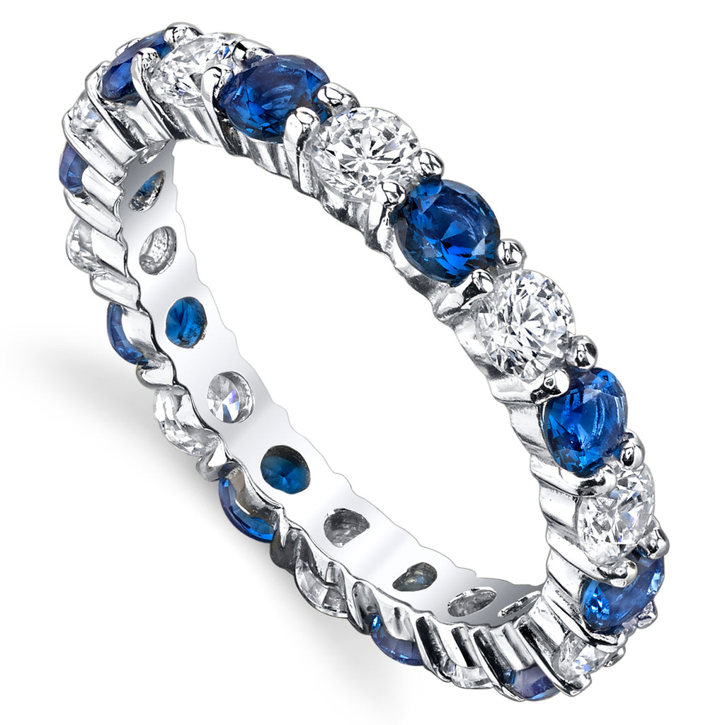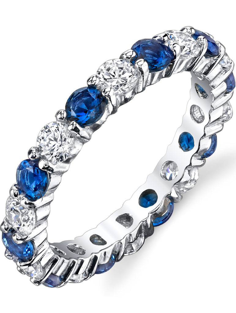 This designer inspired eternity wedding ring is made out of 925 sterling silver. The band is 3.5mm in width, and is set with clear and simulated sapphire blue color Cubic Zirconia. The ring comes with a Complimentary Ring Box!!