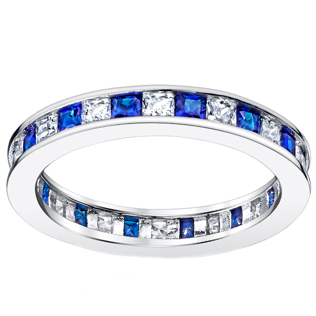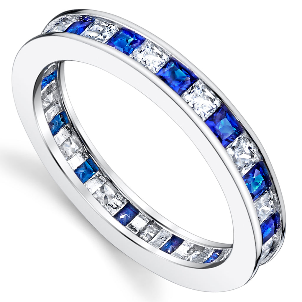 This designer inspired eternity wedding ring is made out of 925 sterling silver. The band is 3.5mm in width, and is set with clear and simulated sapphire blue color princess cut cubic zirconia. The ring is rhodium plated and comes with a Complimentary Ring Box!!