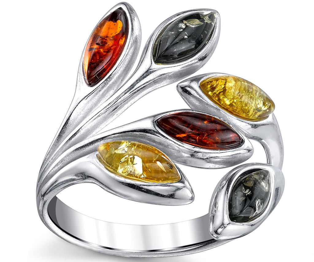 This gorgeous ring is finely crafted of sterling silver and gleams with a high polish finish. The ring is set with six multi color cherry, honey, olive and cognac leaf, marquise design genuine Baltic Amber.The ring is finished with rhodium plating and come with a Complimentary Ring Box. ideal gift birthdays, Christmas, Valentines day.