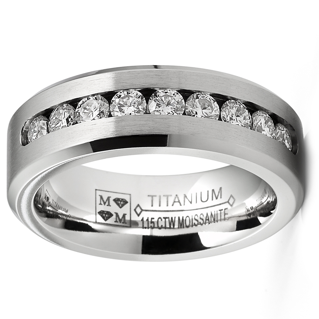 Discover the perfect fusion of modern durability and breathtaking brilliance with this Men's Titanium Moissanite Wedding Band. Crafted for the contemporary man, this striking 8mm ring features a rugged, yet sophisticated, brushed titanium finish contrasted with a dazzling channel of genuine Moissanite stones.