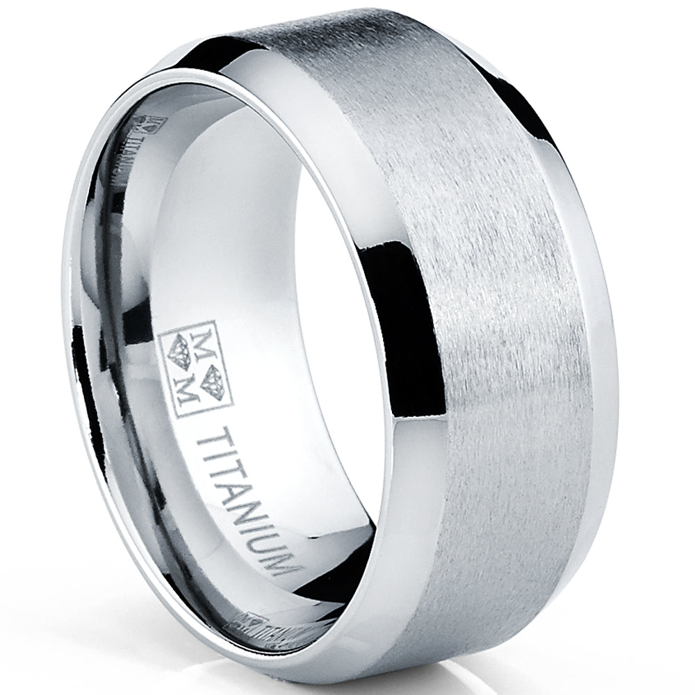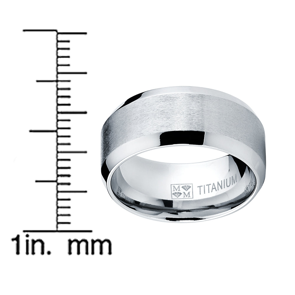 This wide wedding band features a flat top brushed ring with high polish beveled edges. The ring is constructed of light weight durable titanium metal. Our rings are hypoallergenic.