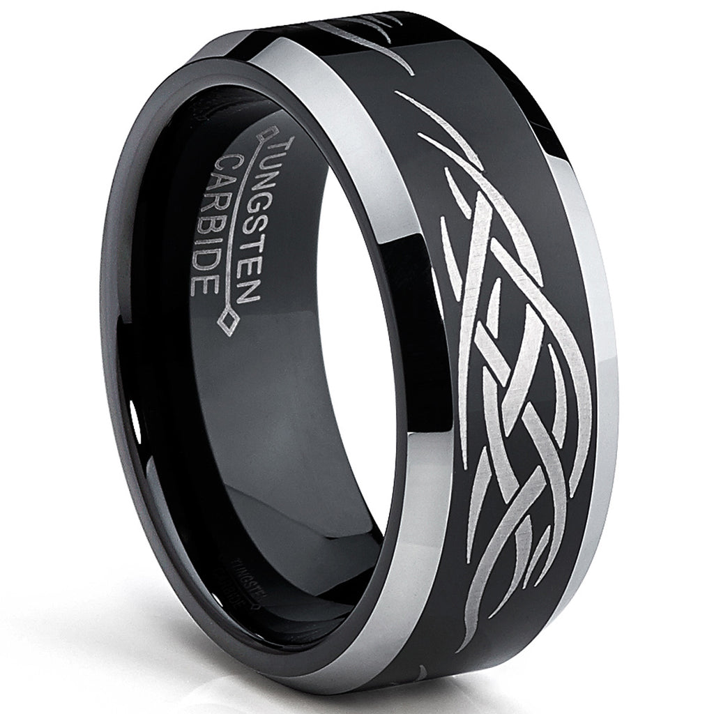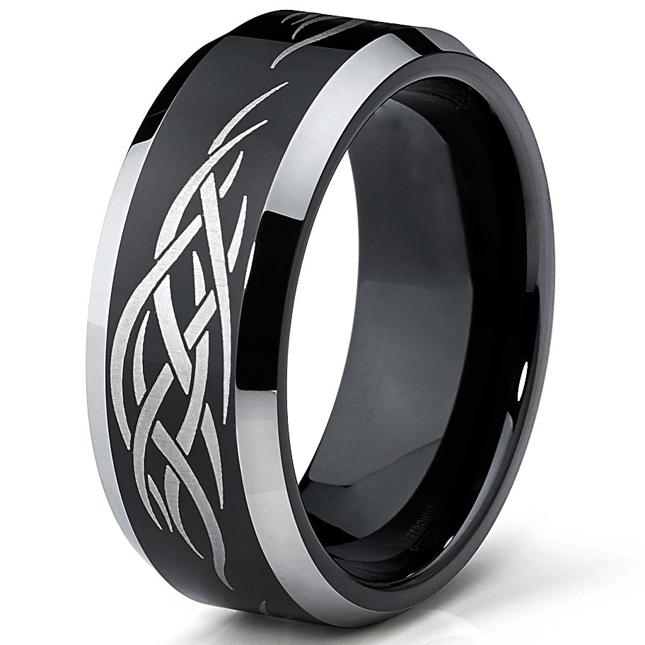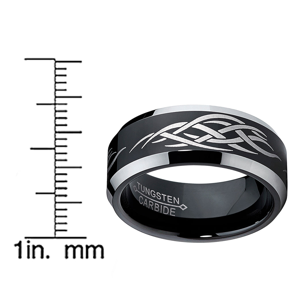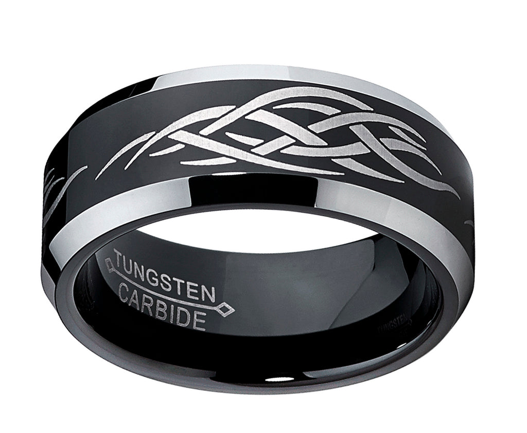 This beautiful Black tungsten carbide ring is 8MM in width and Comfort fit. It is all high polish with beveled edges and laser etched Tribal design. If you are looking for a ring that is scratch-resistant and forever keep its shine, then our Tungsten Carbide rings are for you. All of our Tungsten rings are hypoallergenic. Due to the hardness of the metal, these rings can be laser engraved, but not hand engraved. Comes with a complimentary ring box.
