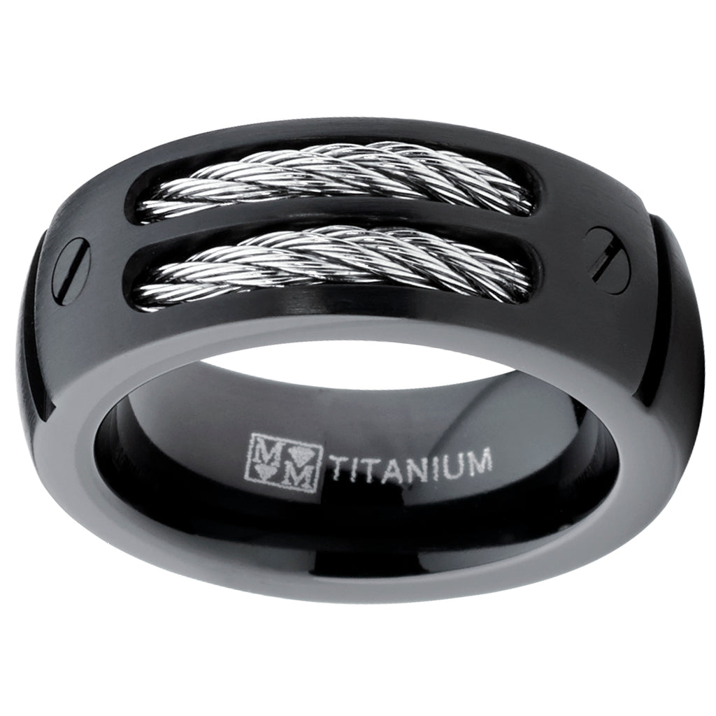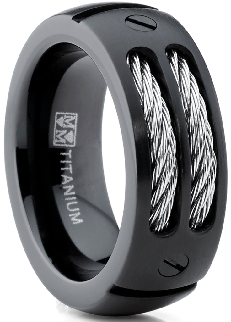 This beautiful Titanium ring is 8MM in width and Comfort fit. It is black plated matte finish with stainless steel cable and 2 screws . Our rings are hypoallergenic. All rings come with a Complimentary Ring Box
