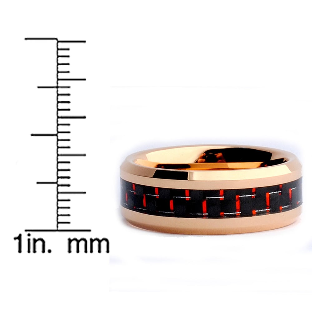 This beautiful tungsten carbide ring is 8MM in width and comfort fit. It is Rose plated with black and red carbon fiber inaly. If you are looking for a ring that is scratch proof and forever keep its shine, than our Tungsten Carbide rings are for you. All of our Tungsten rings are Cobalt Free and hypoallergenic. Our rings Due to the Hardness of Tungsten, these rings can be laser engraved, but not hand engraved. All ring come with a Complimentary Leather Ring Box.