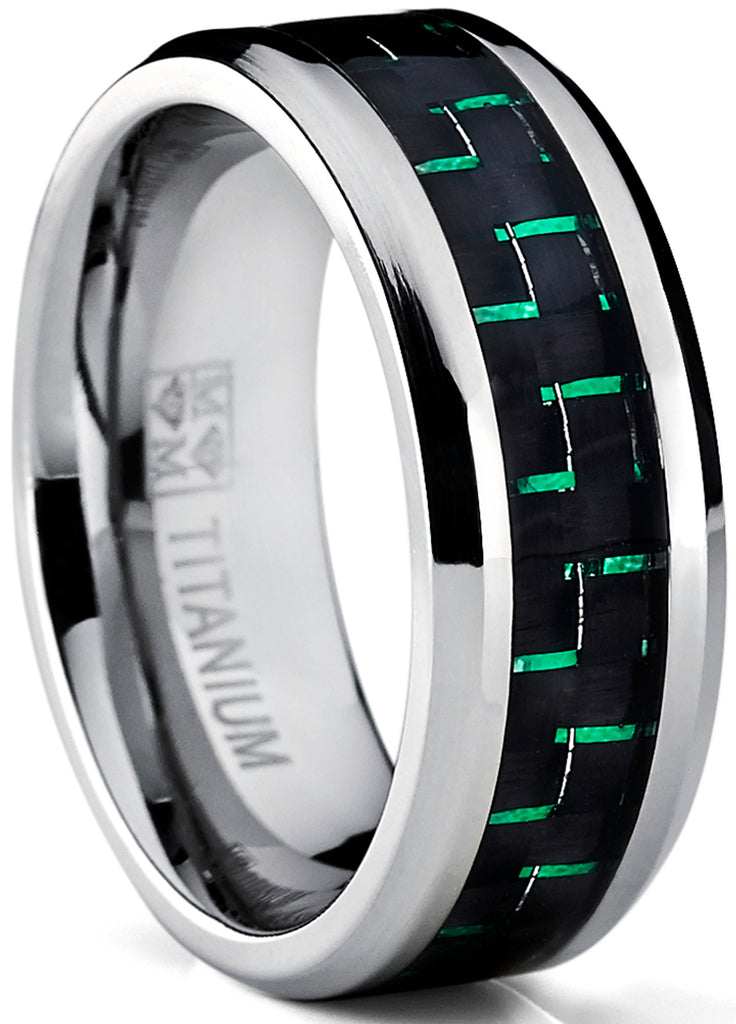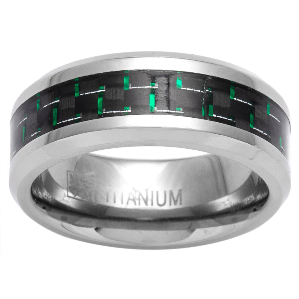 This band features a high polish finish ring with a black and green carbon fiber inlaid center. Our rings are hypoallergenic.