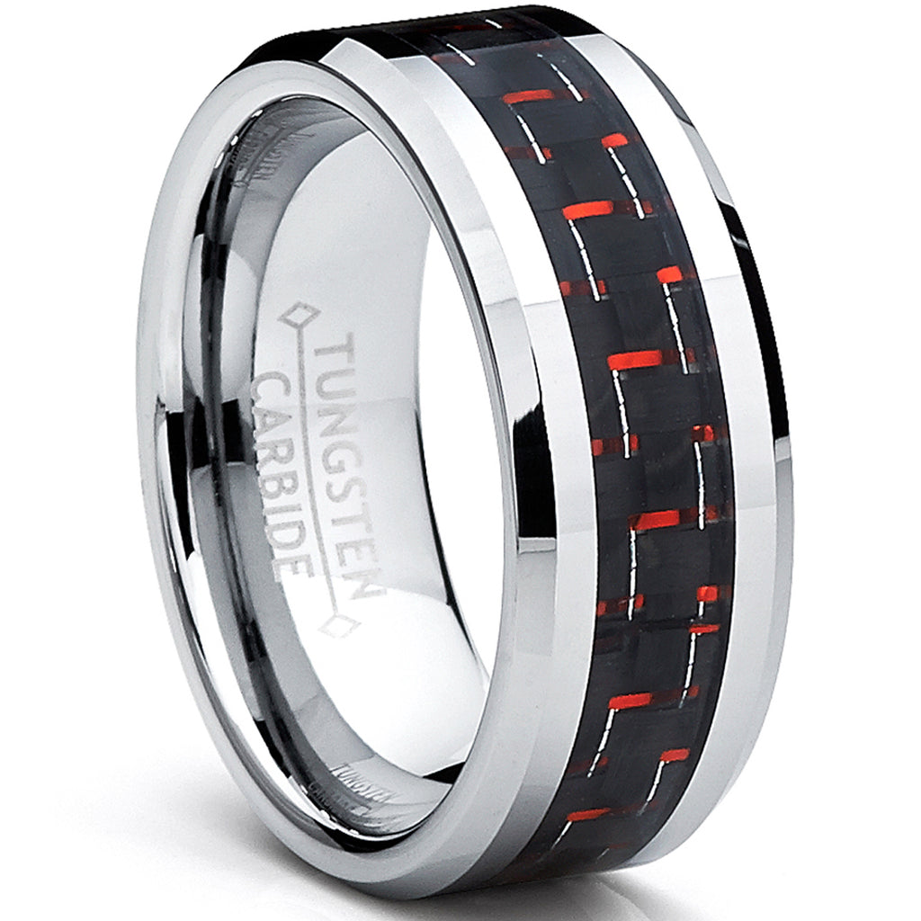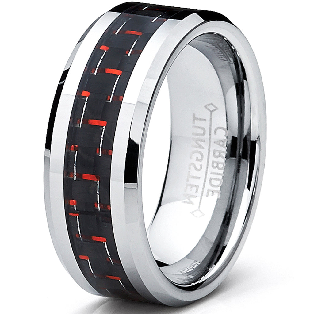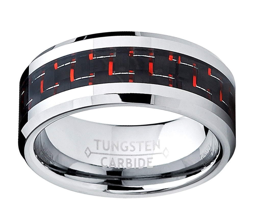 This beautiful tungsten carbide ring is 8MM in width and comfort fit. It is all high polish with beveled edges and has black & Red carbon fiber inlay. If you are looking for a ring that is scratch proof and forever keep its shine, than our Tungsten Carbide rings are for you. All of our Tungsten rings are Cobalt Free and hypoallergenic. Our rings Due to the Hardness of Tungsten, these rings can be laser engraved, but not hand engraved. All ring come with a Complimentary Leather Ring Box.
