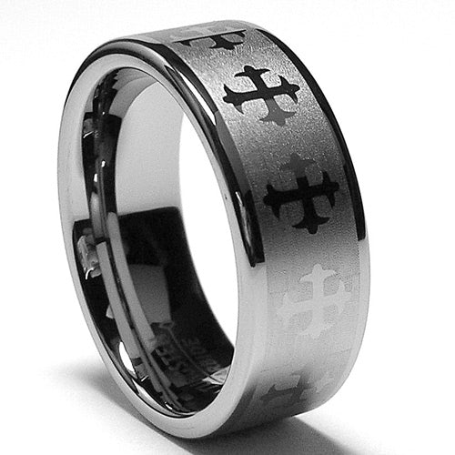 This beautiful tungsten carbide ring is 8MM in width and comfort fit. It is white in color with infinity laser etched cross design. If you are looking for a ring that is scratch proof and forever keep its shine, than our Tungsten Carbide rings are for you. All of our Tungsten rings are Cobalt Free and hypoallergenic. Our rings Due to the Hardness of Tungsten, these rings can be laser engraved, but not hand engraved. All ring come with a Complimentary Leather Ring Box.