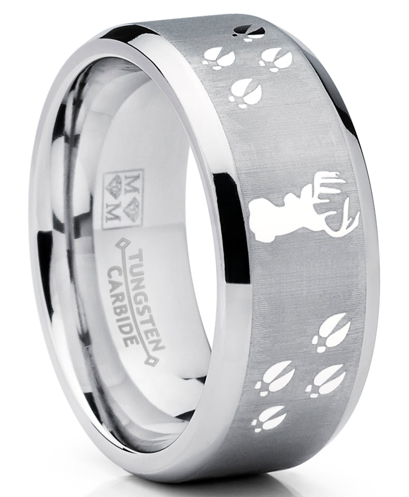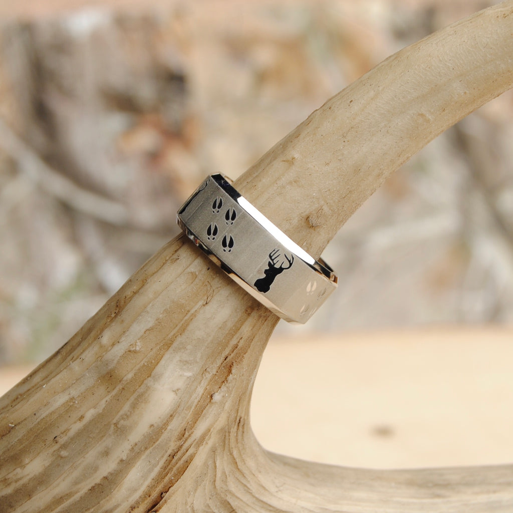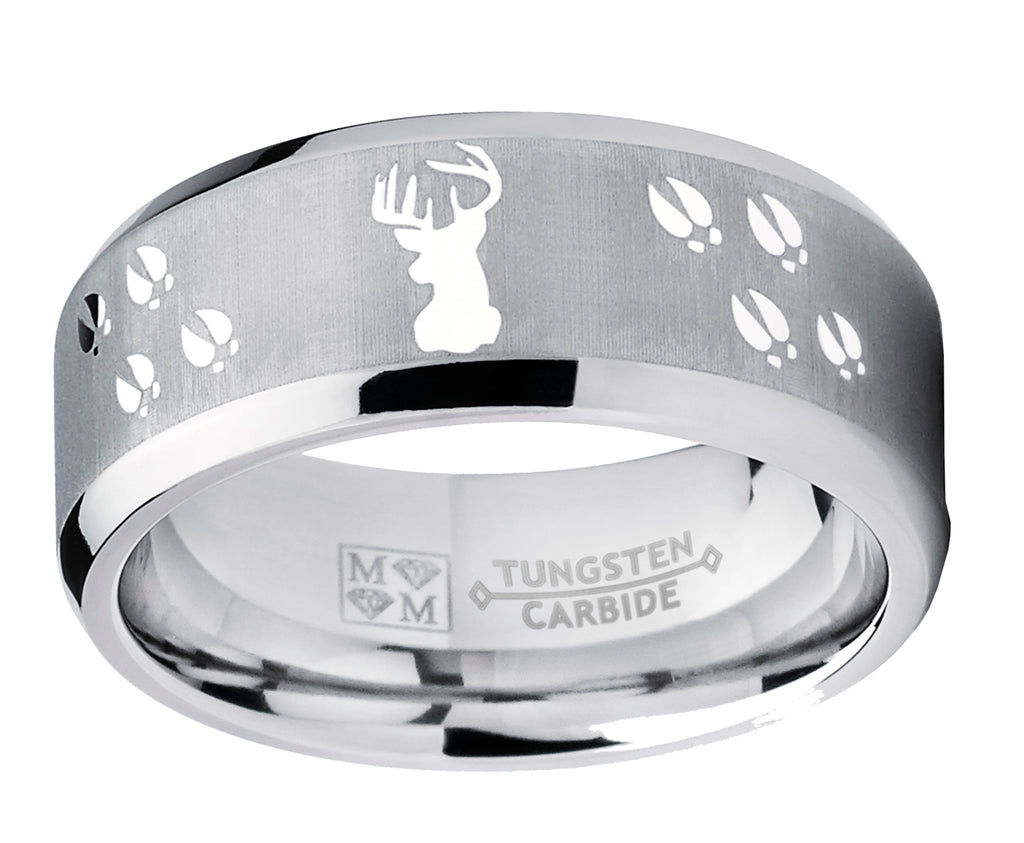 Display your true love of hunting with this deer tracks and deer image wedding ring! If you are a hunter or know one, then this is the best gift or wedding band for you. This stunning tungsten ring features a flat top band with beveled edges and Comfort fit. The center of the ring is satin with high polish deer tracks and deer image. Our rings are hypoallergenic. Rely on the sturdy tungsten metal for a durable piece of jewelry that stands up to the rigors of continuous wear for years to come. Tungsten is four times as sturdy and strong as titanium and features a scratch-resistant finish.