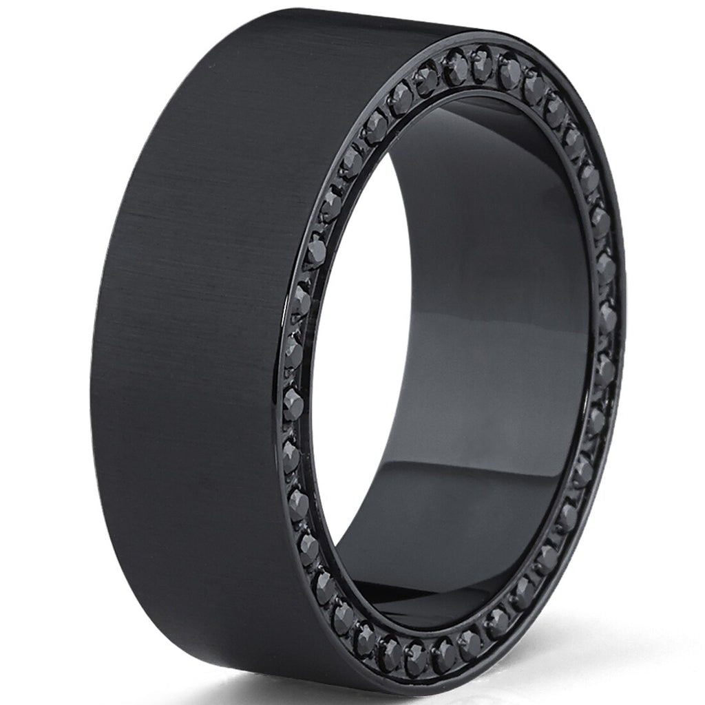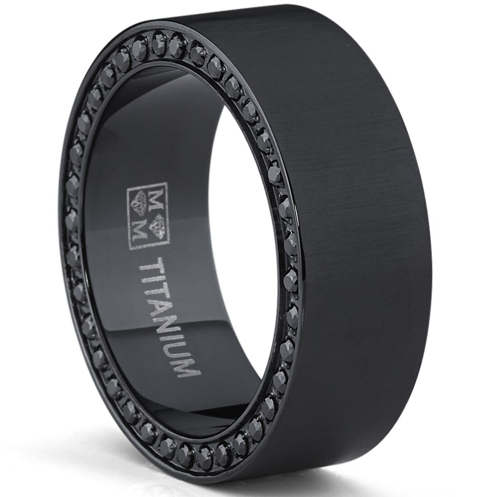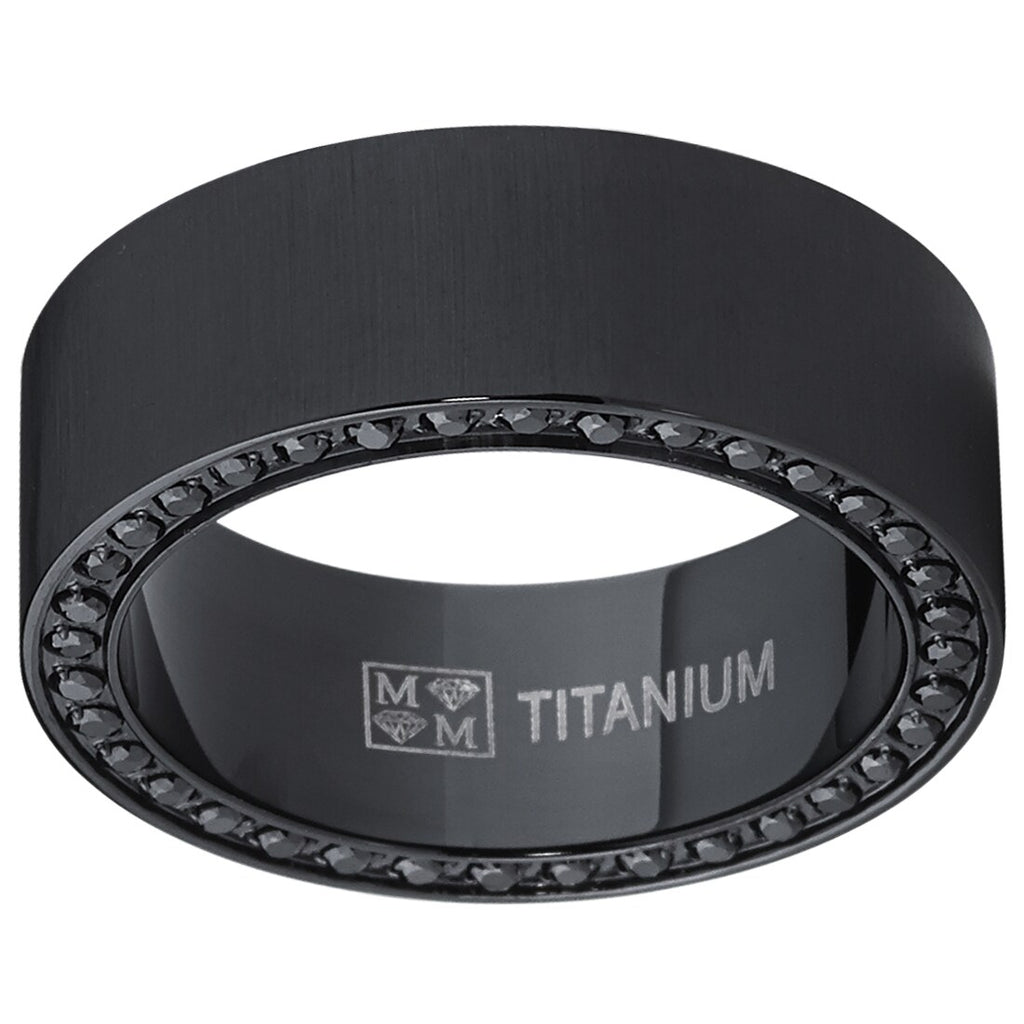 This stunning black wedding band features a flat top satin finished ring with two rows of black cubic zirconia on the rim of the ring. The ring is constructed of light weight durable titanium metal. Our rings are hypoallergenic.