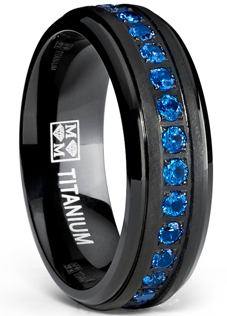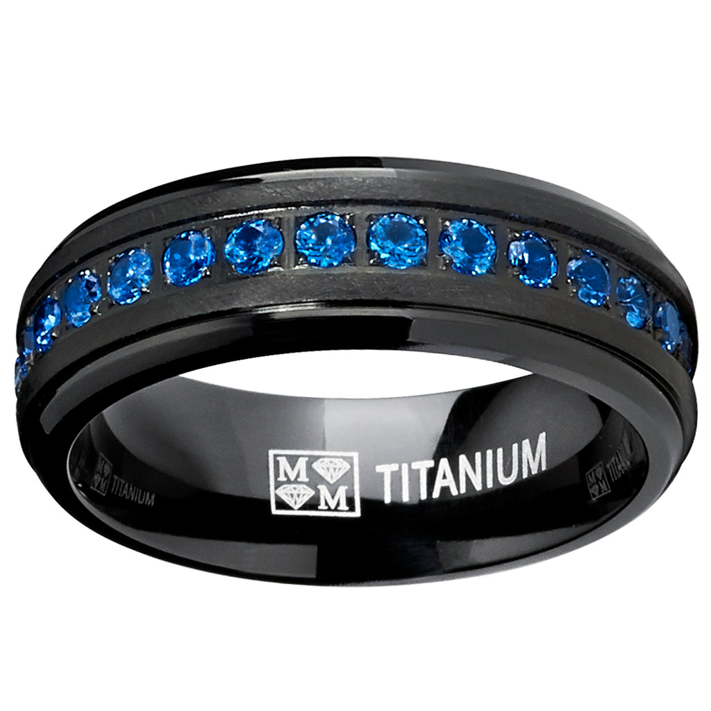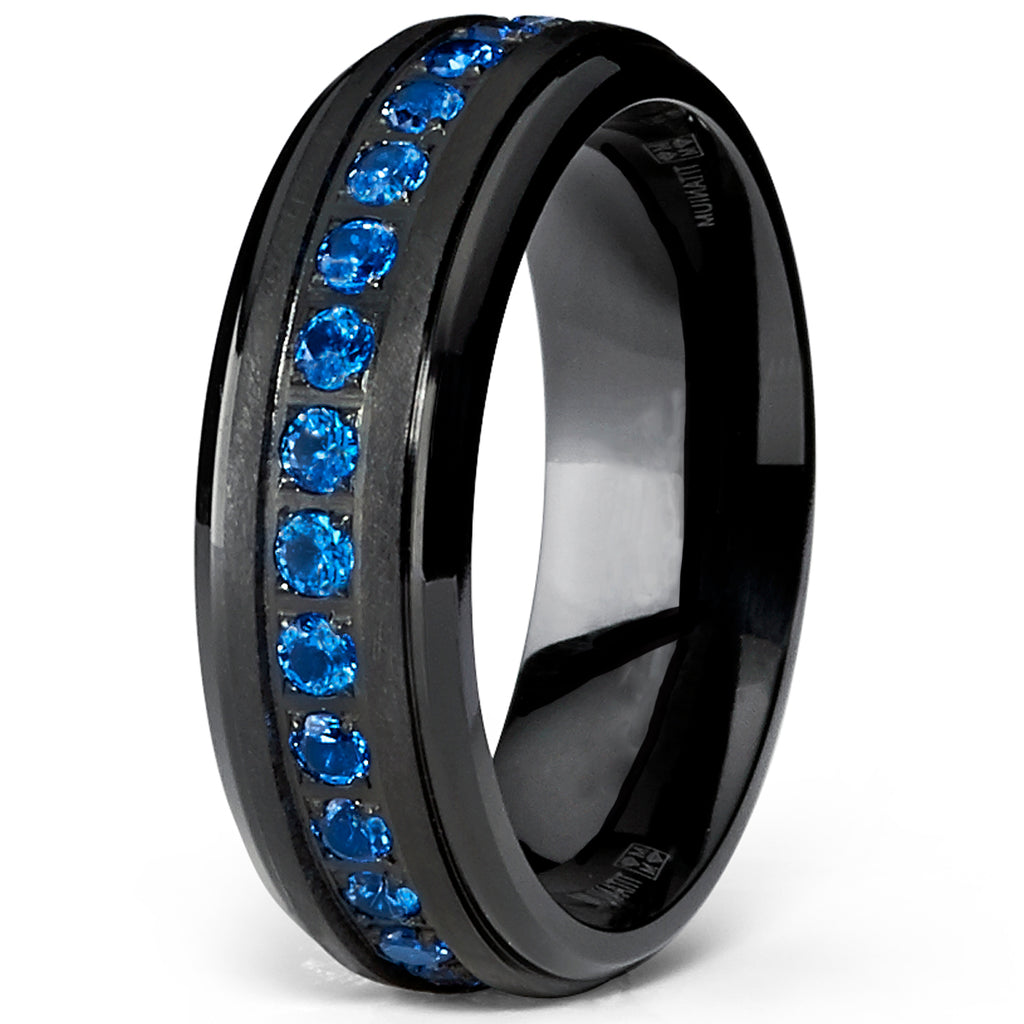 This stylish titanium ring is black plated with slight dome textured brushed center and is set with four prong, deep blue round-cut cubic zirconia stones.