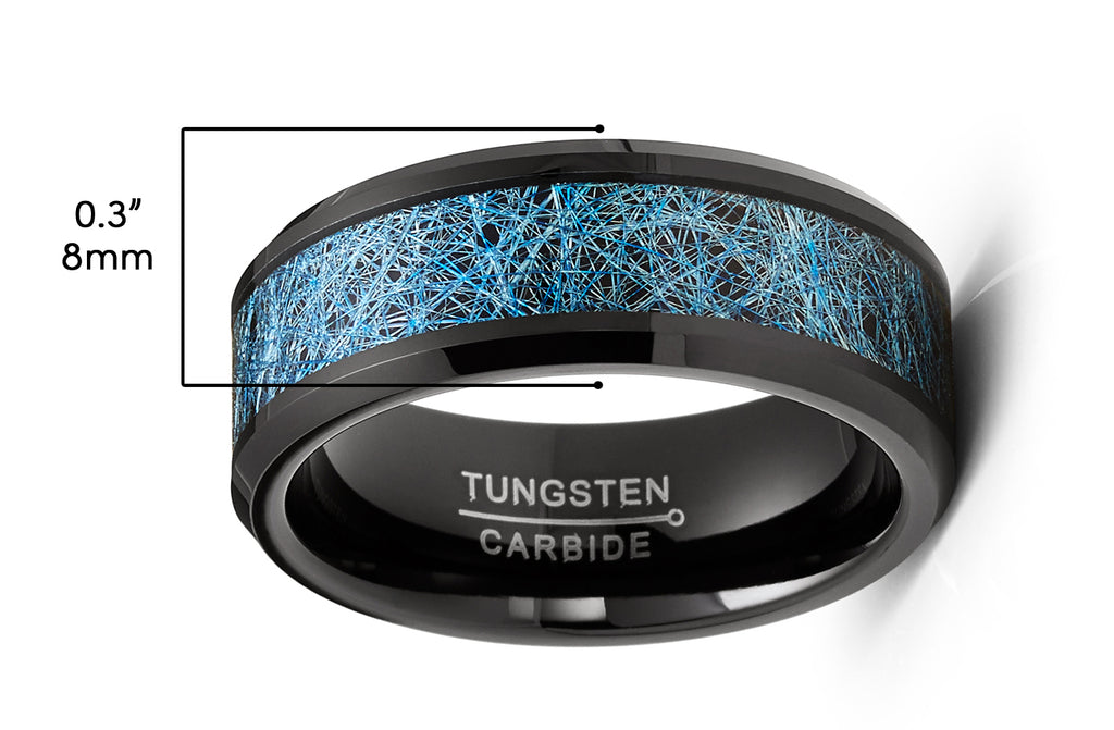 Featuring an inlay of threaded blue silk in the center, this unique comfort-fit Tungsten Carbide ring for men is for those with an appreciation to details. The beveled edges have a ideally polished surface which compliments this 8-millimeter, black wedding band with a contoured inner surface for a more comfortable fit with everyday use in mind.