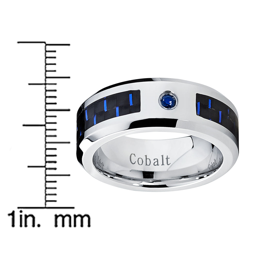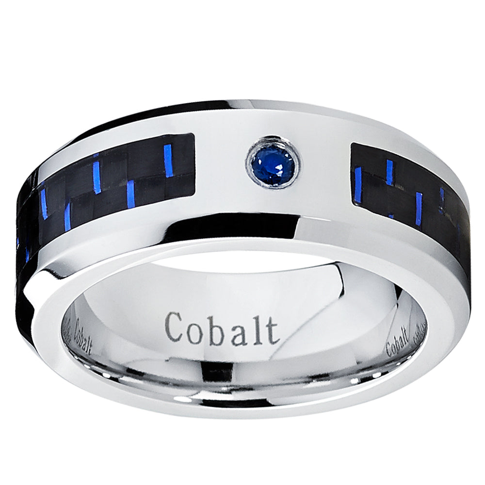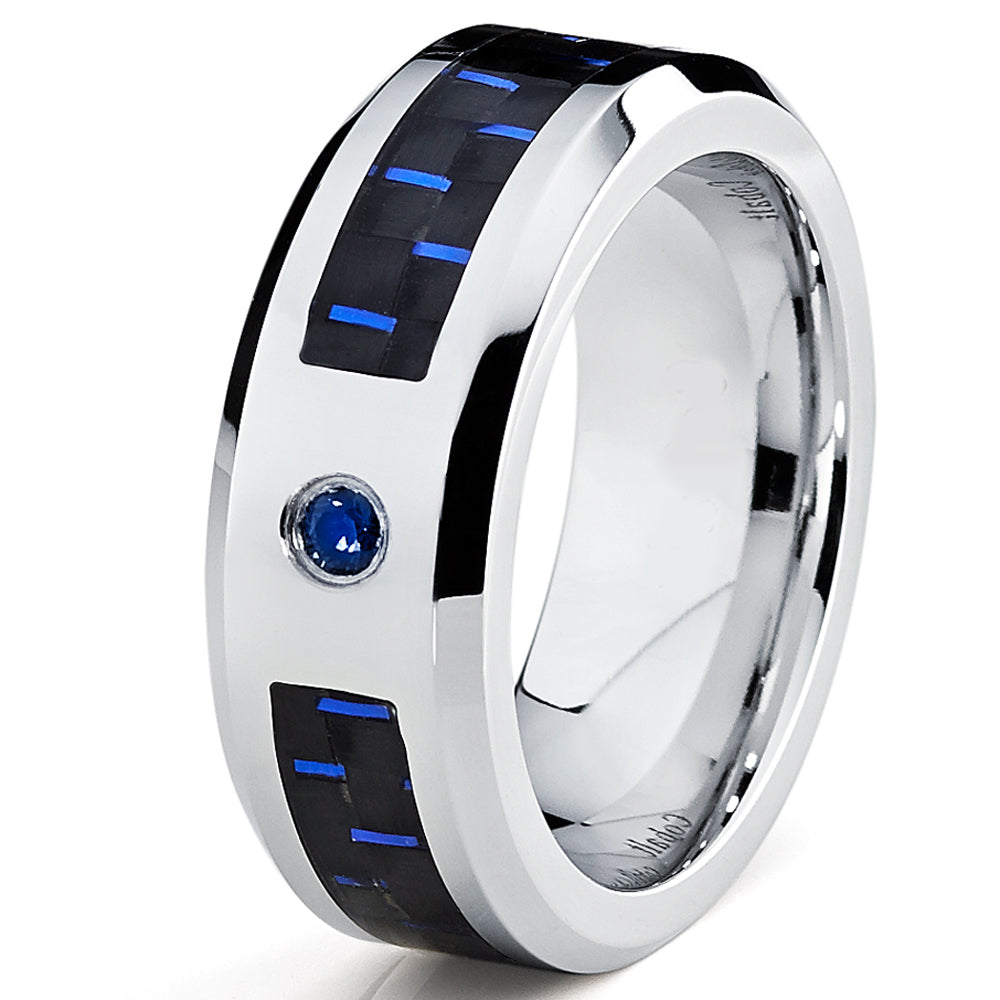 This captivating men's ring is crafted of scratch-resistant Cobalt Chrome material. The band is all high polish with black and blue carbon fiber inlay and 0.05 carat blue Sapphire Stone( Stone is heat treated to improve appearance and durability).The Cobalt material is used in the medical applications such as prosthetics. Cobalt Chrome Band will not chip, break or shatter. Occasional polishing may be required. All items come with a Complimentary Ring Box.