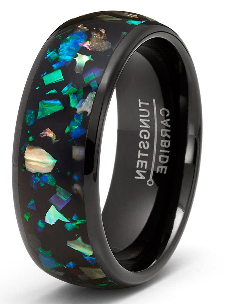 Opal and Abalone shells are crushed and inlaid on this unique and detail oriented Tungsten Carbide ring for men. The stepped edges have a ideally polished surface with a contoured black inner band for a more comfortable fit with everyday use in mind.