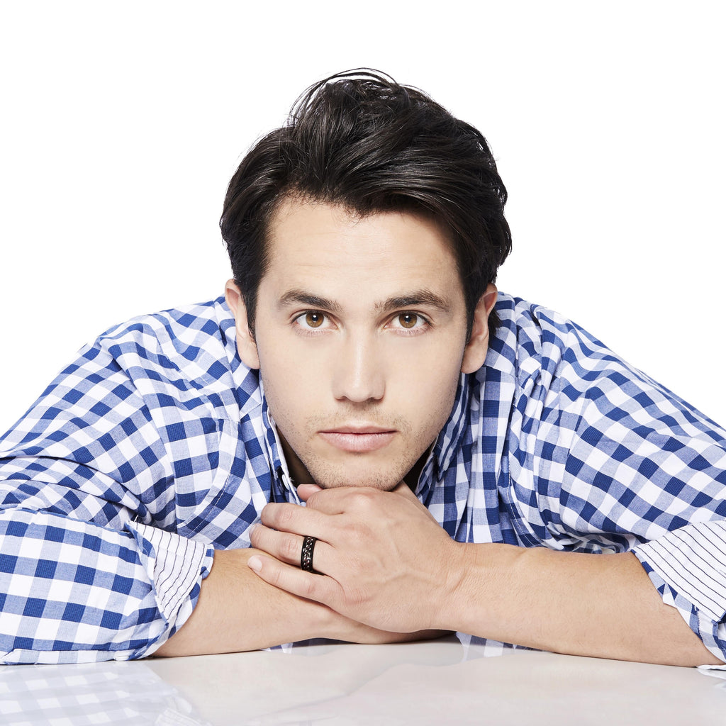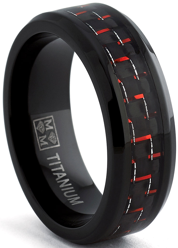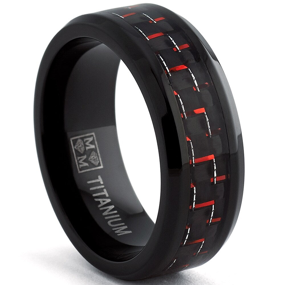 This band features a black high polish finish ring with a black and red carbon fiber inlaid center. Our rings are hypoallergenic.