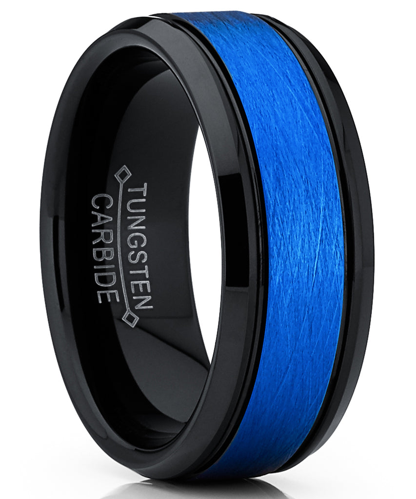 This handsome flat-top ring features a black and blue plated band with a textured brushed finished center. Crafted of durable tungsten, this unique ring has beveled edges for a Comfortable fit. If you are looking for a ring that is scratch-resistant and forever keep its shine, than our Tungsten Carbide rings are for you. All of our Tungsten rings arehypoallergenic. Due to the hardness of the metal, these rings can be laser engraved, but not hand engraved. Comes with a complimentary jewelry ring box.