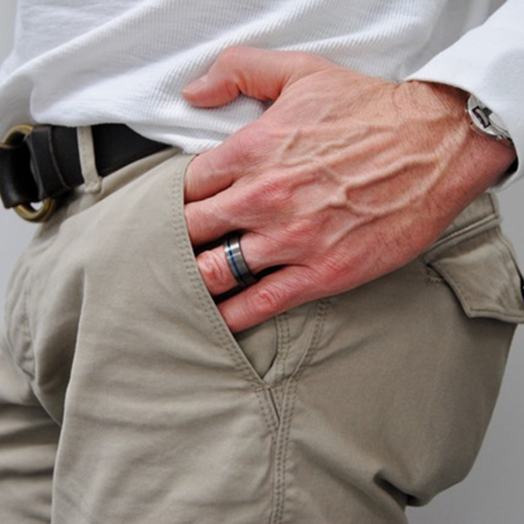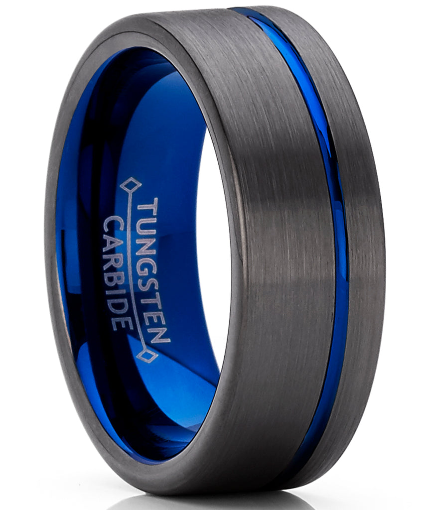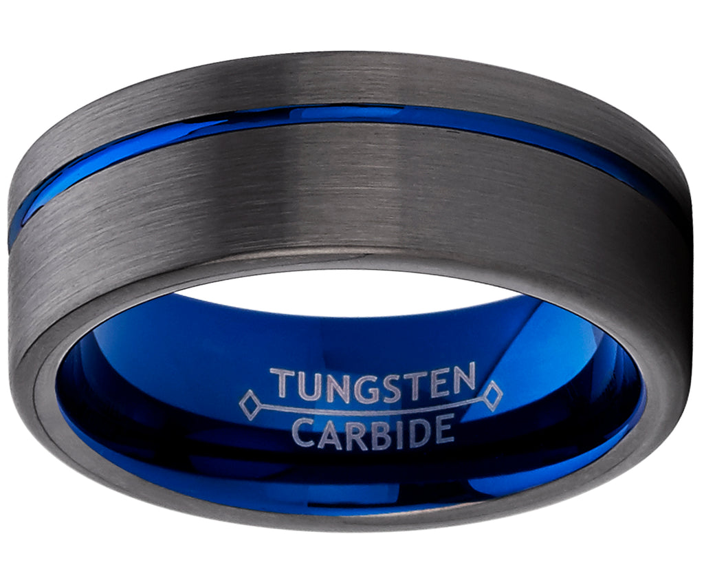 Celebrate your nuptials with this blue off-center tungsten men's wedding band. This heavyweight metal ring is both masculine and sophisticated with a brushed gun metal and blue plating that provides subtle elegance.