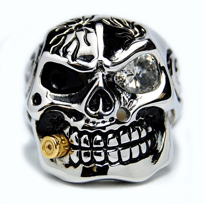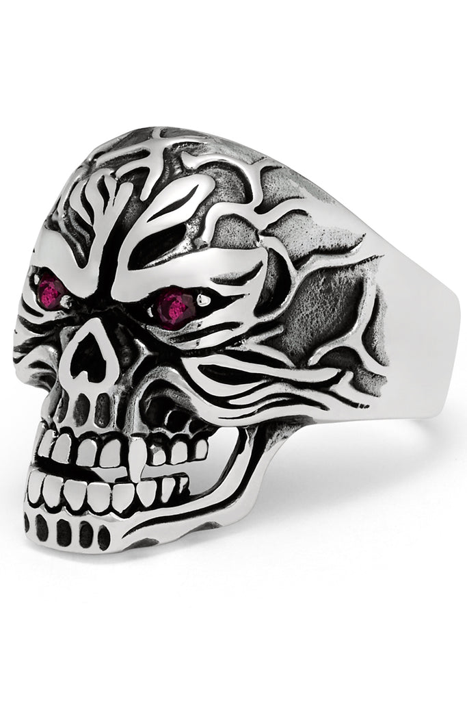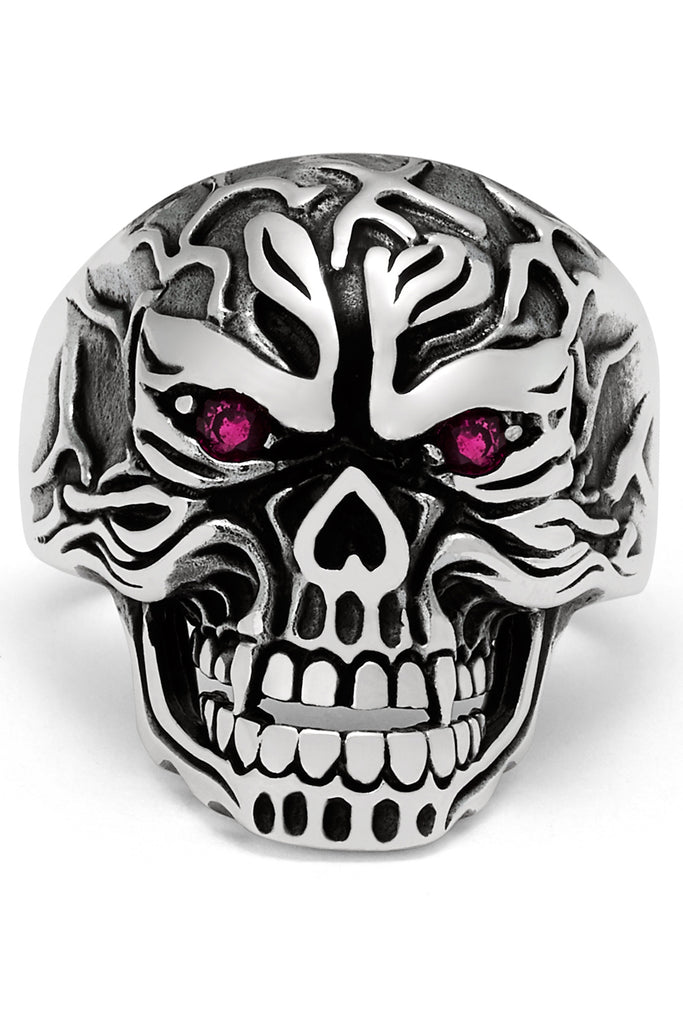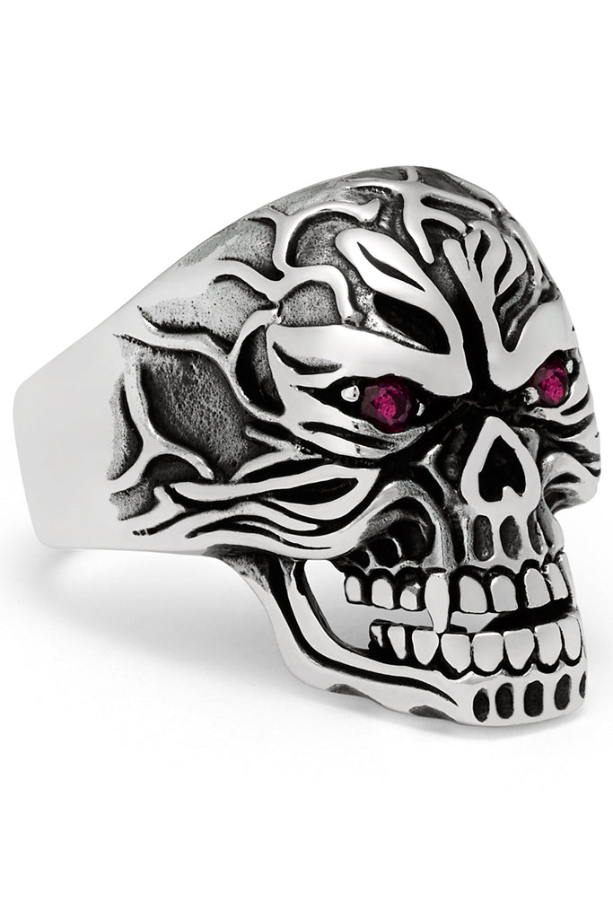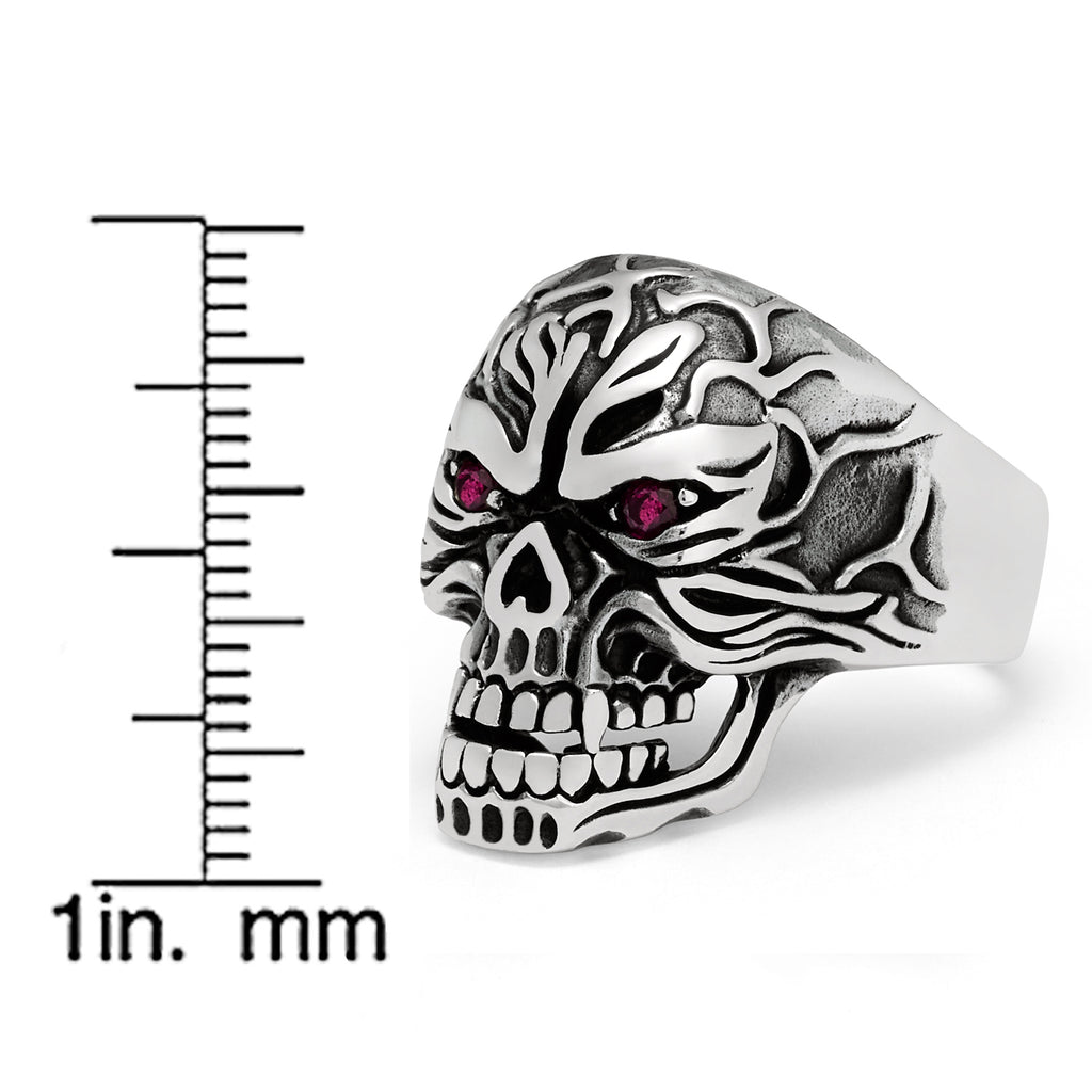 The ideal fashion accessory to compliment your style. This well crafted Sterling Silver ring features a frightening Skull design with oxidized finish and two red ruby stones as eyes, making it ideal for bikers, hard rock, metal music, or goth enthusiasts.