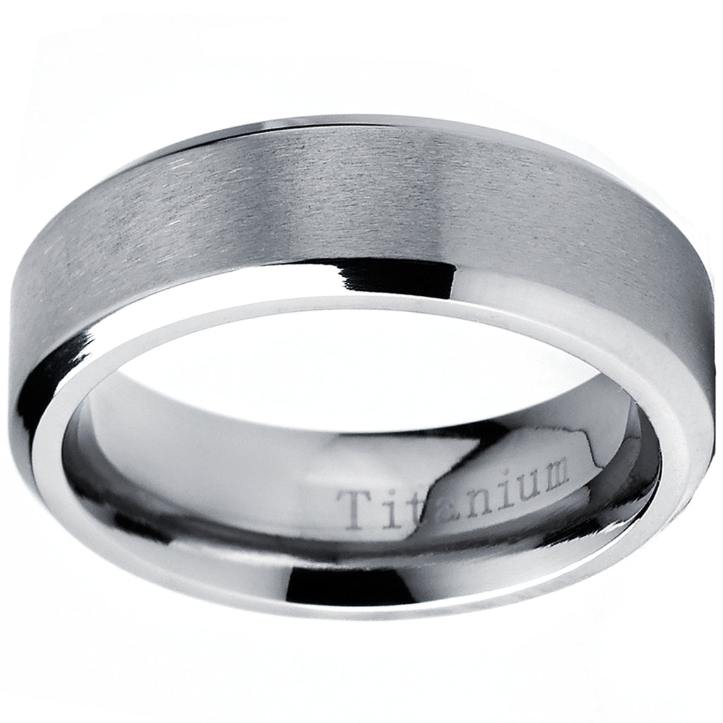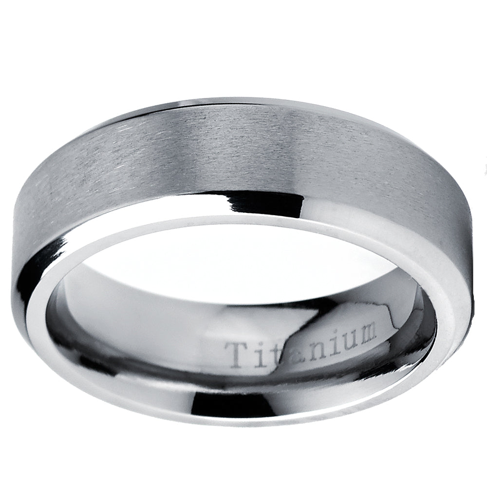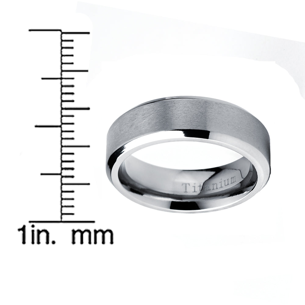 This captivating wedding band features a flat top brushed ring with high polish beveled edges. The ring is constructed of light weight durable titanium metal. Our rings are hypoallergenic.