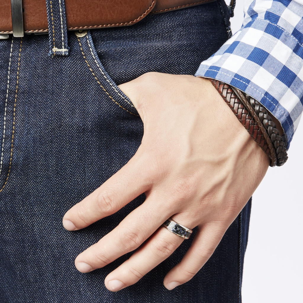 This modern wedding band features a flat top ring complemented with black and blue carbon fiber inaly in the center. The ring is constructed of light weight durable titanium metal. Our rings are hypoallergenic.