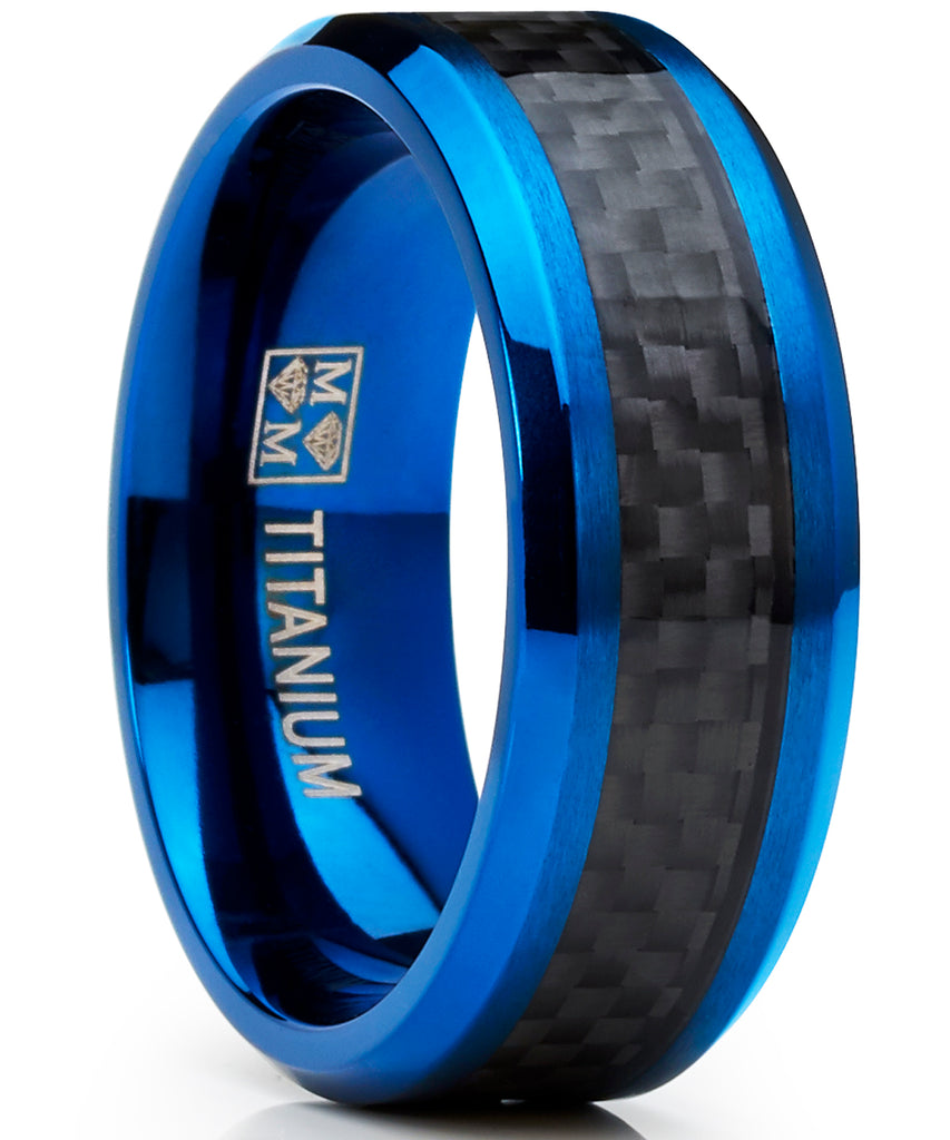 Add a fashionable piece to your accessories collection with this stylish titanium ring. This sleek blue plated ring features a brushed finish carbon fiber inlay with high polish beveled edges.