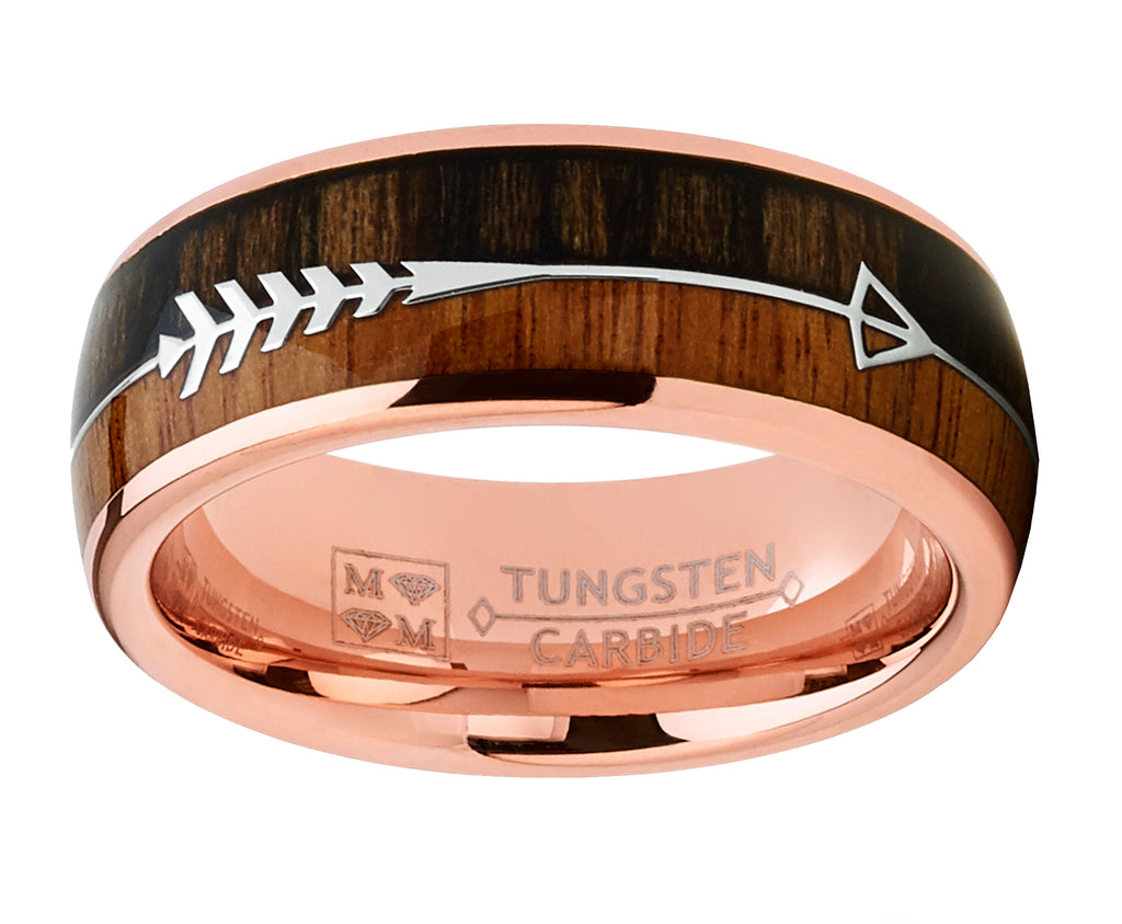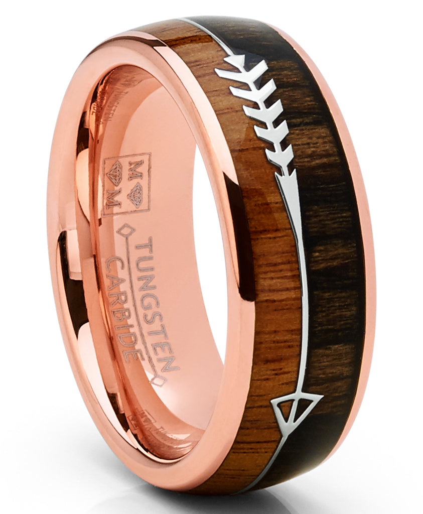 Add a little something unique and elegant to your jewelry collection with this rose goldtone band. The ring features a real two tone real Koa wood inlay and a strip of Native America arrow design in the center. Our tungsten wedding rings are most suitable substitute of yellow gold, white gold and platinum, they are excellent gifts for wedding, engagement, anniversary, Party, birthday, valentine's, thanksgiving, christmas day for men and women. Tungsten Wedding Bands are the newest trends in jewelry, not only because they are known as one of the hardest metals in the world, but also they remain the exact same luster after many years wearing. Tungsten carbide ring is around 10 times harder than 18k gold, so if you are looking for a ring that is scratch proof and forever keeps its shiny, then our tungsten wedding rings will be good choice for you.