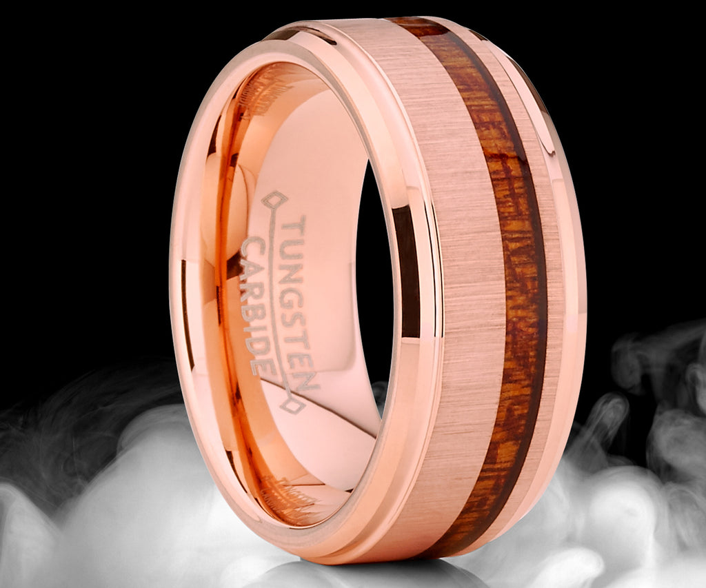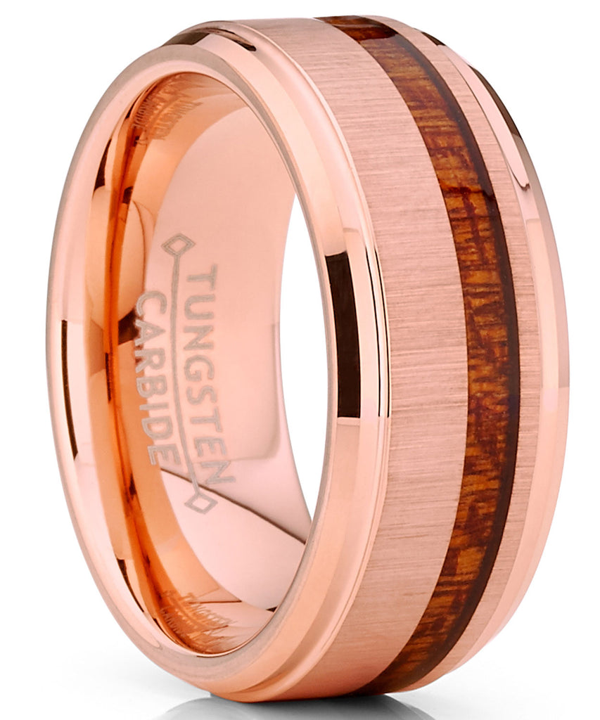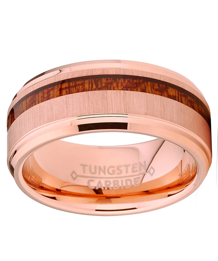Add a little something unique and elegant to your jewelry collection with this rosetone ring. A strip of durable, coated koa wood is inlaid into this RoseGold Tone tungsten band. The 9-millimeter ring features a contoured inner surface for a more comfortable fit with everyday use in mind. Rely on the sturdy tungsten metal for a durable piece of jewelry that stands up to the rigors of continuous wear for years to come. Tungsten is four times as sturdy and strong as titanium and features a scratch-resistant finish. This modern ring is the ideal complement for a lifelong commitment wedding band has a high polish finish on the tungsten carbide metal. This durable ring features a flat top horizontal brushed ring with high polish beveled edge.