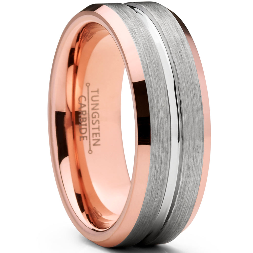 Show your loyalty to your loved one with this rose tone tungsten men's wedding band. This heavyweight metal ring is both masculine and sophisticated with a grooved center brushed silver finish that provides subtle elegance. The 8-millimeter band features a contoured inner surface for a more comfortable fit with everyday use in mind. Rely on the sturdy tungsten metal for a durable piece of jewelry that stands up to the rigors of continuous wear for years to come. Tungsten is four times as sturdy and strong as titanium and features a scratch-resistant finish. This simple and modern ring is the ideal complement for a lifelong commitment wedding band has a grey and rose tone finish on the tungsten carbide metal. This durable ring features a high polish finish and domed, comfort-fit design