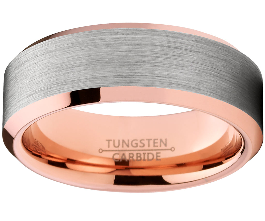 Show your loyalty to your loved one with this rose tone tungsten men's wedding band. This heavyweight metal ring is both masculine and sophisticated with a grooved center brushed silver finish that provides subtle elegance. The 8-millimeter band features a contoured inner surface for a more comfortable fit with everyday use in mind. Rely on the sturdy tungsten metal for a durable piece of jewelry that stands up to the rigors of continuous wear for years to come. Tungsten is four times as sturdy and strong as titanium and features a scratch-resistant finish. This simple and modern ring is the ideal complement for a lifelong commitment wedding band has a grey and rose tone finish on the tungsten carbide metal. This durable ring features a high polish finish and domed, comfort-fit design