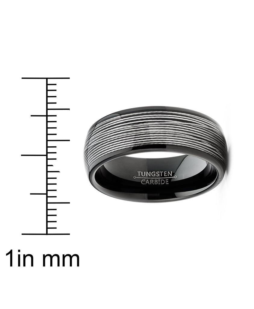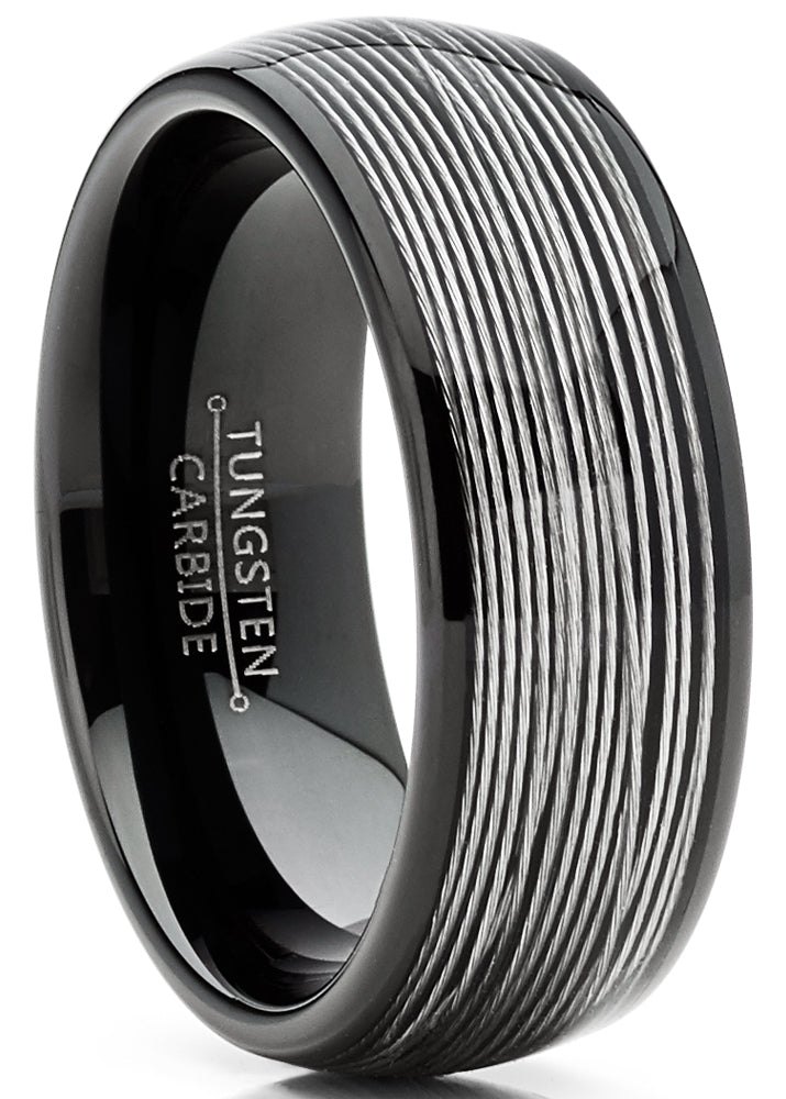 As tough as they come! This black and silvertoned Tungsten ring for men boasts a truly unique look with a row of "Steel Cables" in the center, a ideal wedding band for your significant other.