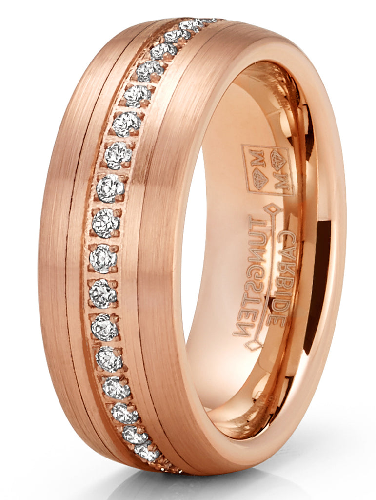 Buffed to a brilliant luster this 8mm minimalist tungsten ring is encircled by 37 channel set round cubic Zirconia stones held by a high polish center eternity wedding band.
