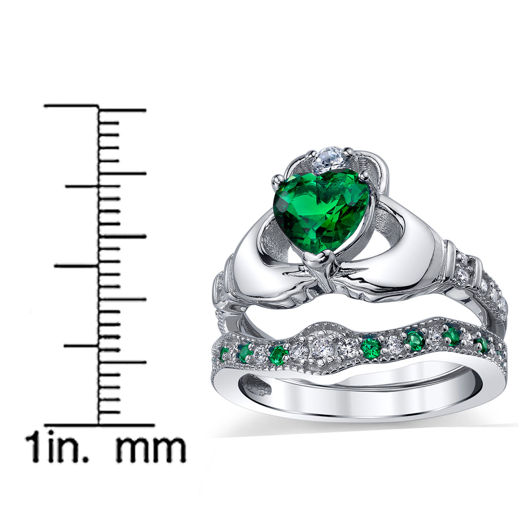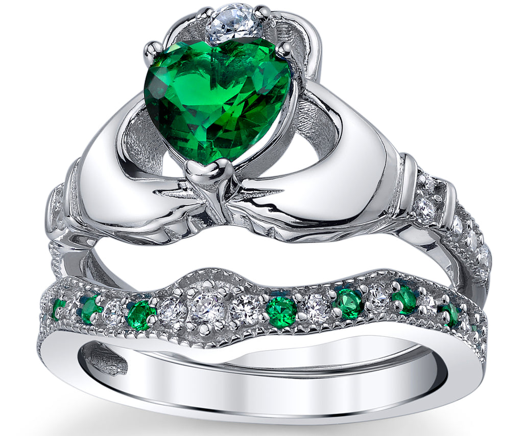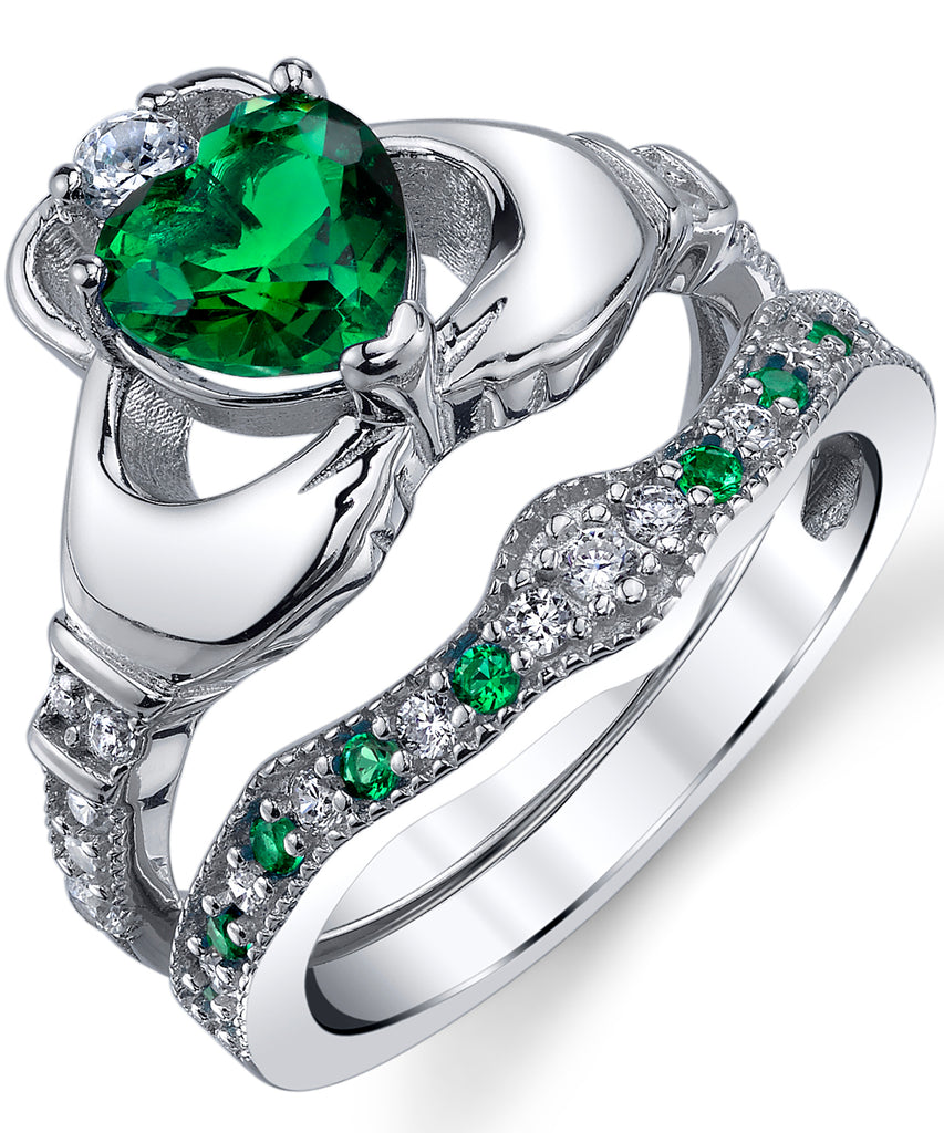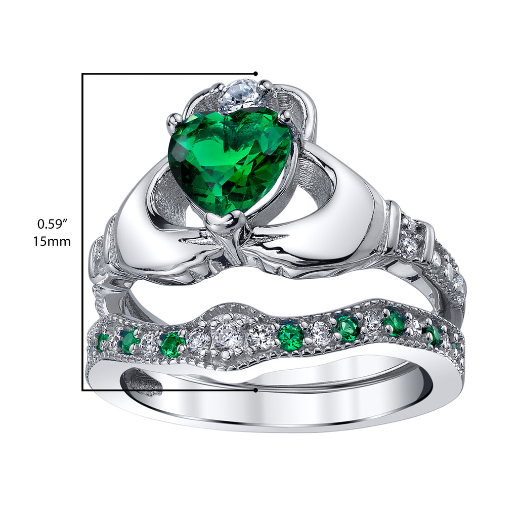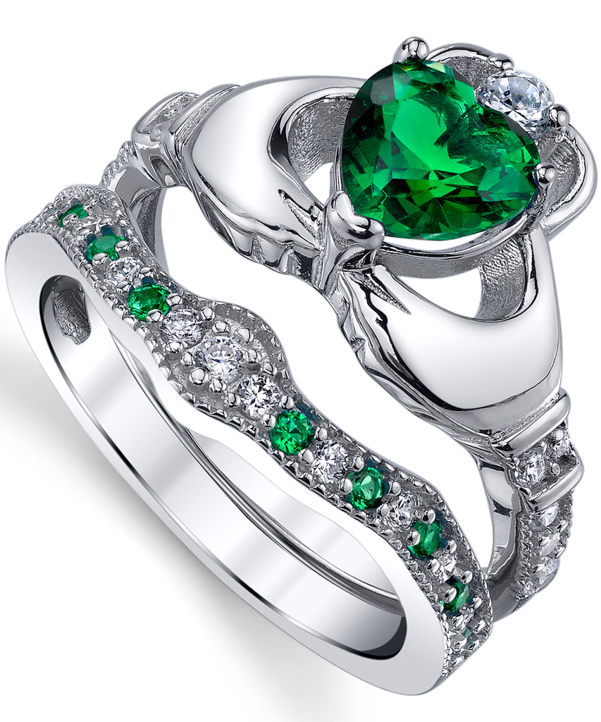 This timeless sterling silver ring features a claddagh design with a distinctive feminine feel. Inspired by the traditional Irish symbol for love, loyalty and friendship, this ring is crafted of sterling silver and adorned with green and white cubic zirconia cz. The center of the ring is set with a simulated Emerald color heart shape cubic zirconia. The rings is rhodium plated and come with a Complimentary Ring Box.