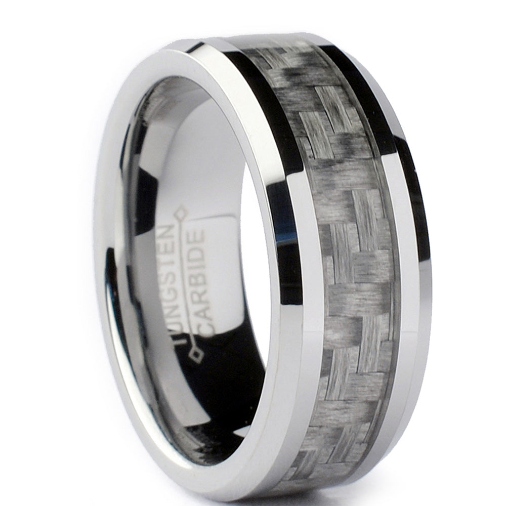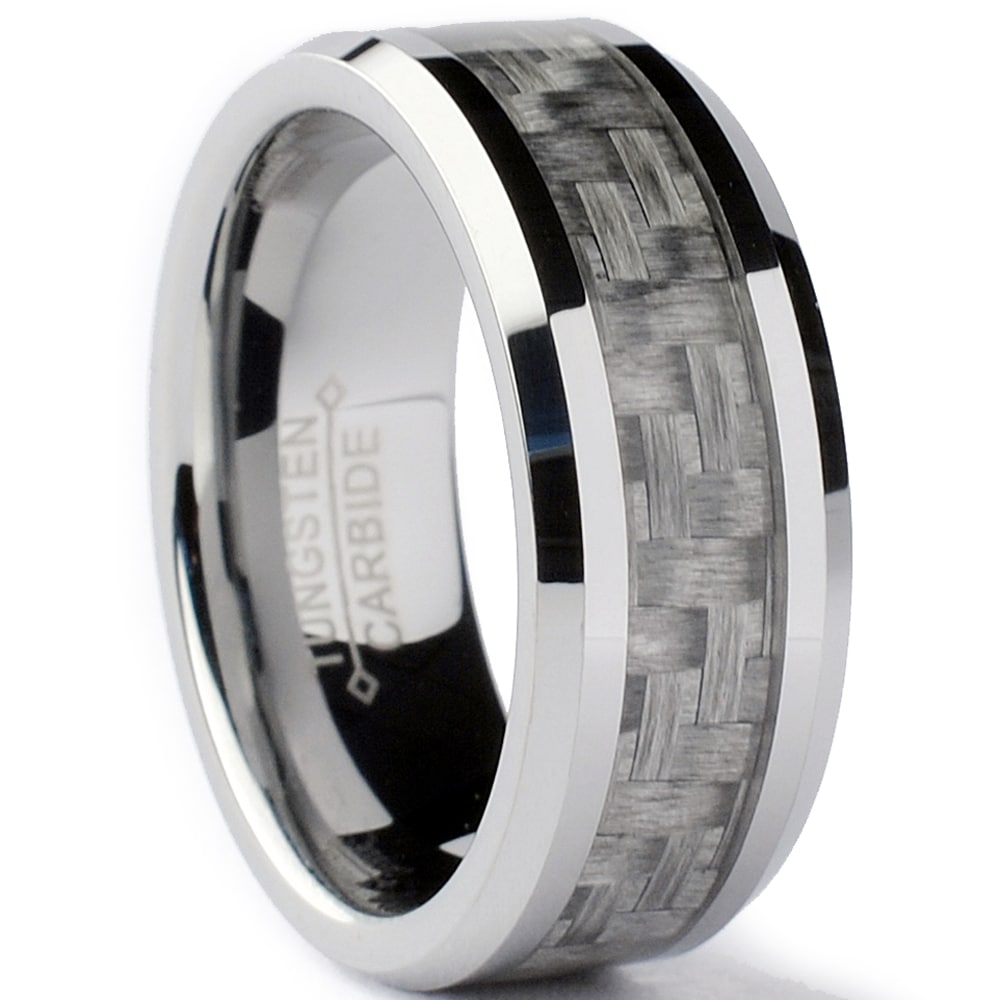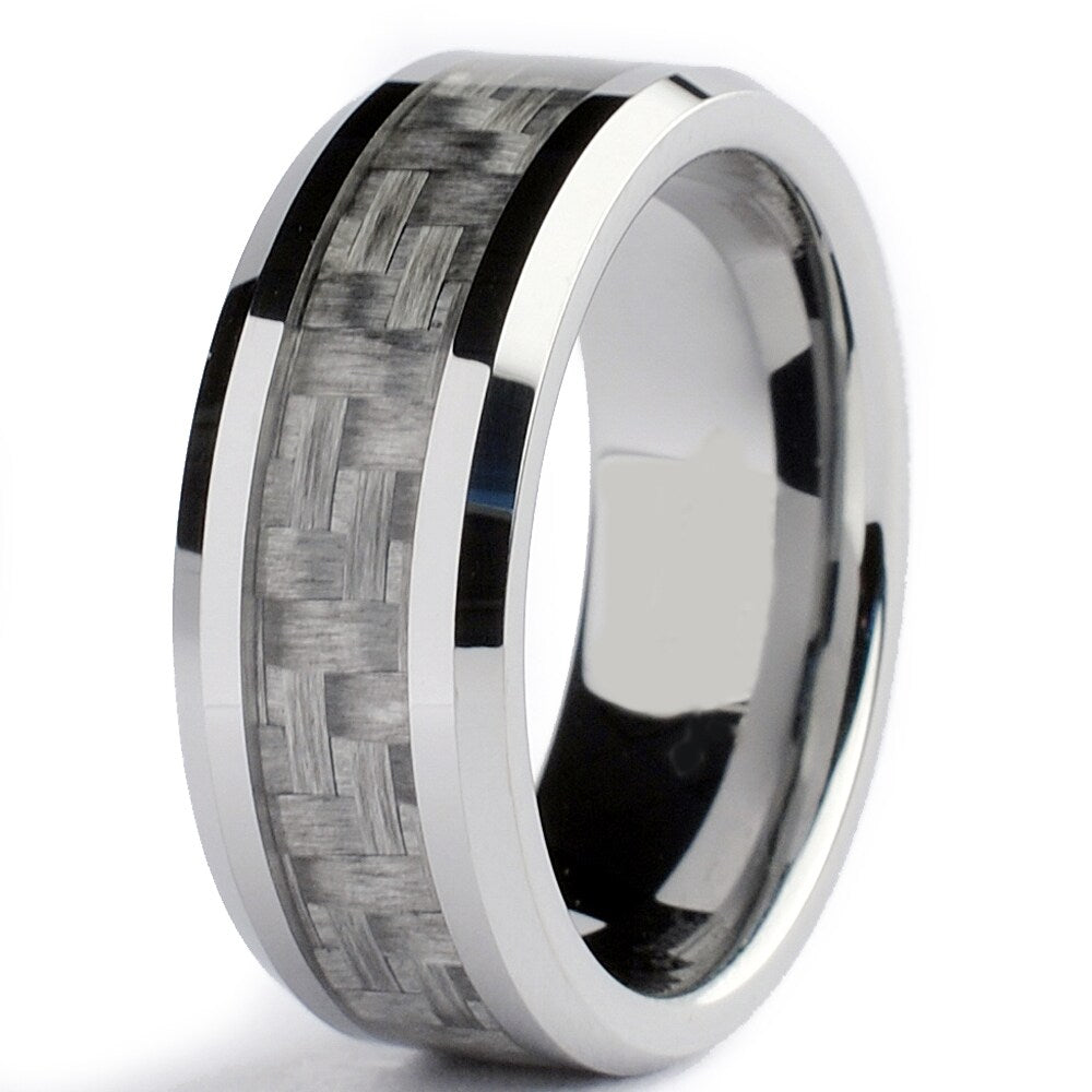 This stylish tungsten carbide ring for men features a comfort fit design. Rich grey carbon fiber inlay adorns the center of this band.