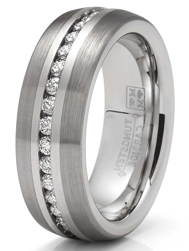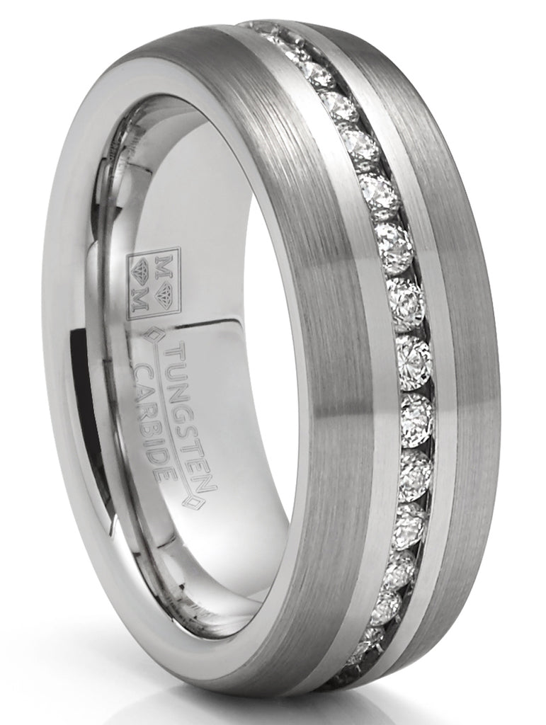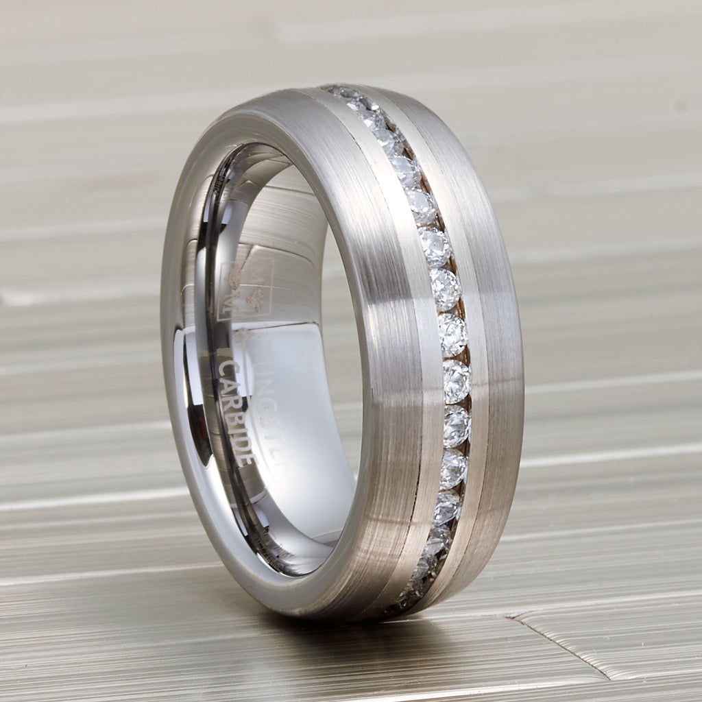 Buffed to a brilliant luster this 8mm minimalist tungsten ring is encircled by 37 channel set round cubic Zirconia stones held by a high polish center eternity wedding band. Available in Silver and Rose Gold.