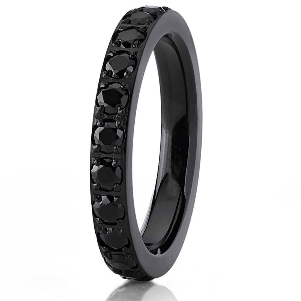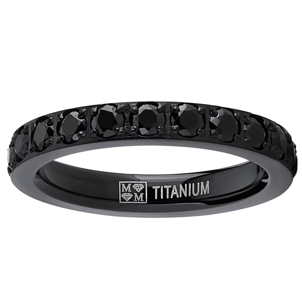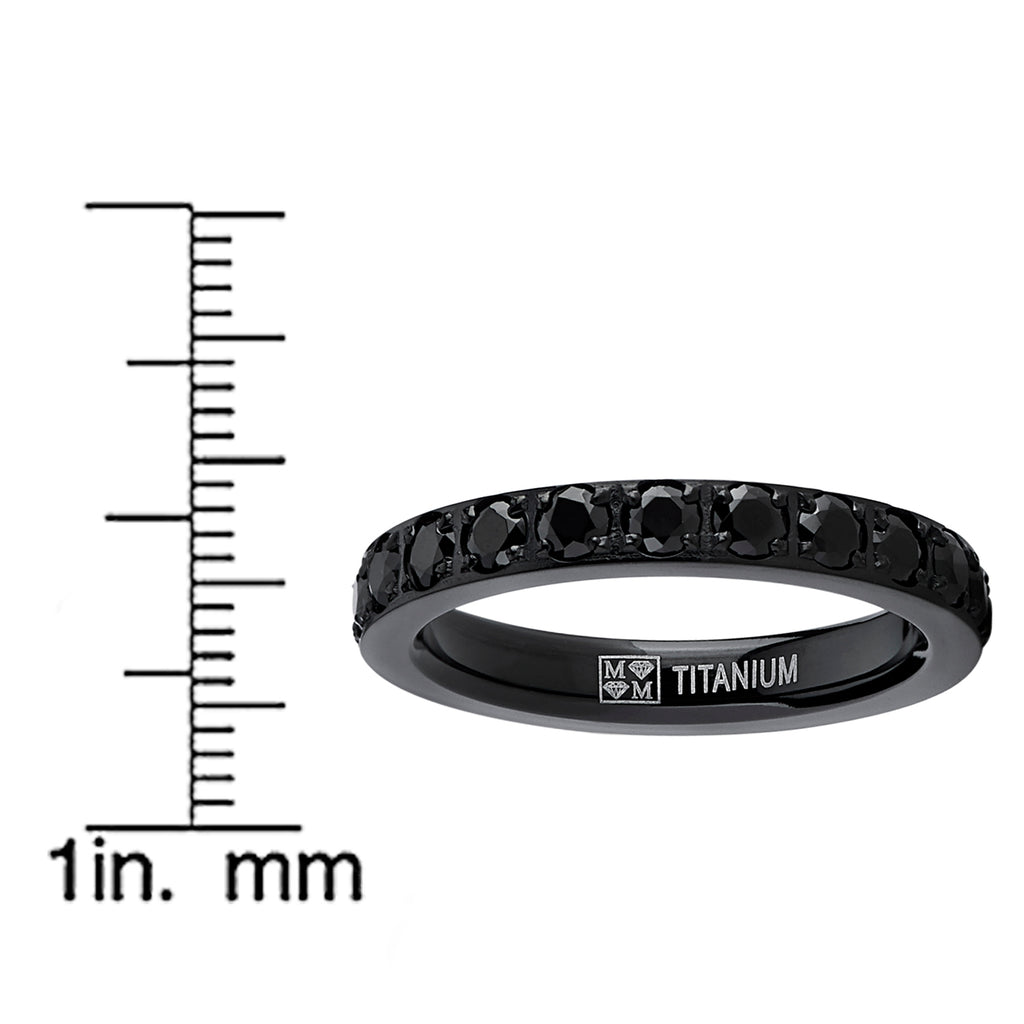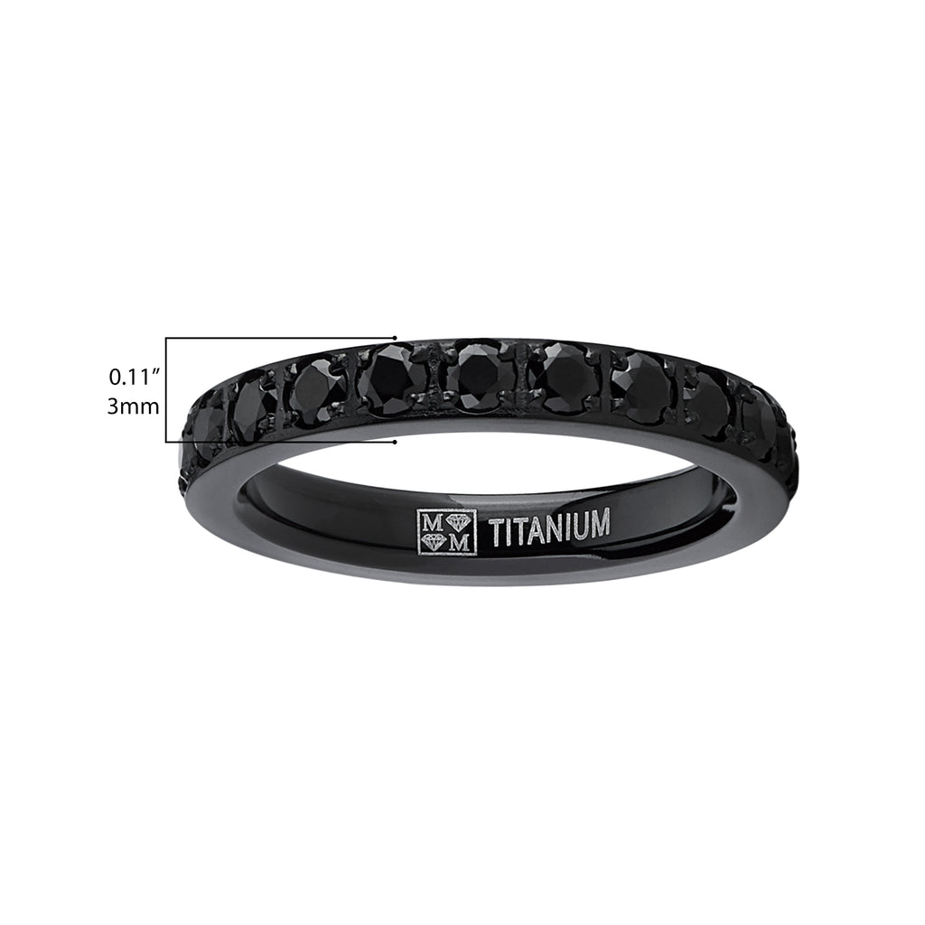 Add an extra touch of radiance for your look with this stunning, 3 millimeters wide wedding band. Crafted from light-weight titanium, this striking black plated ring features a pave set round black cubic zirconia band in a glittering line.