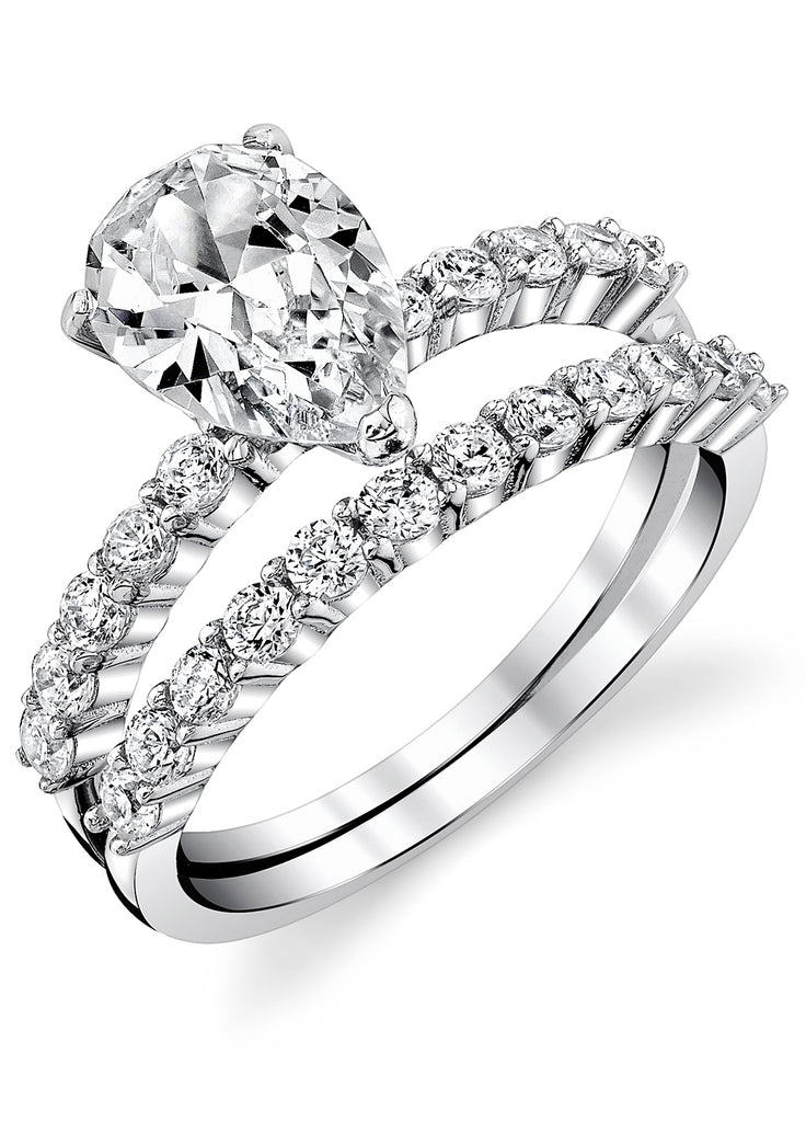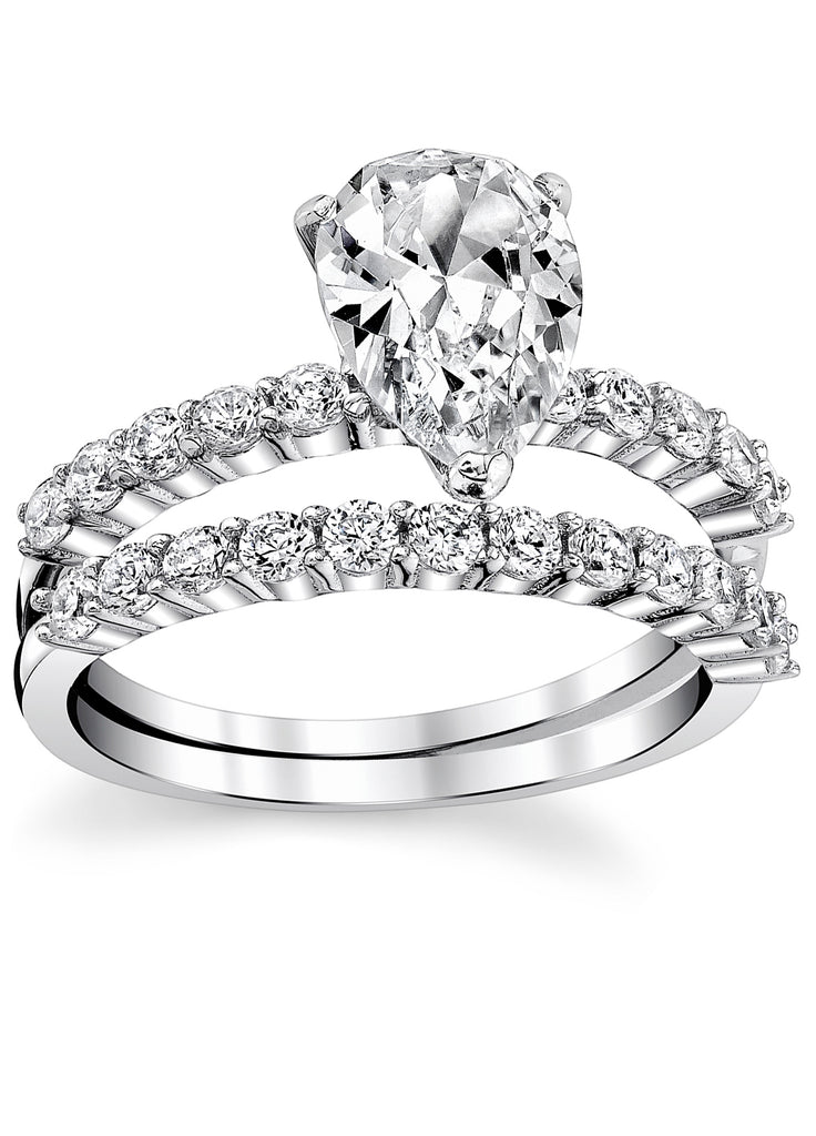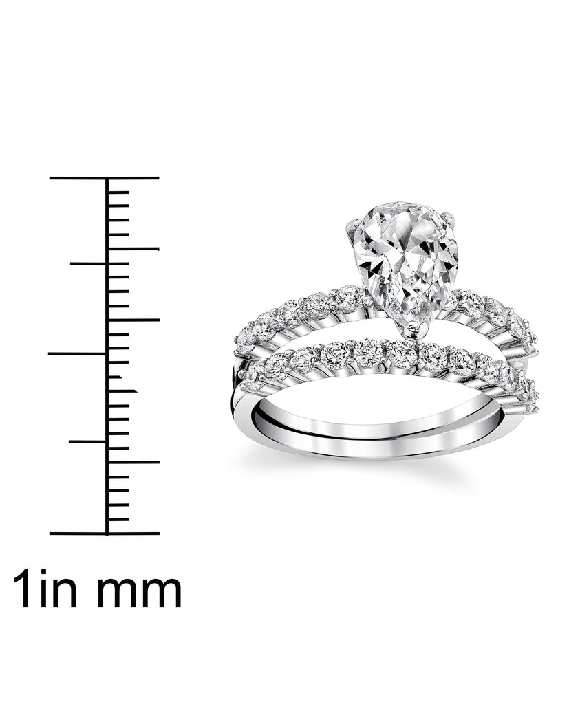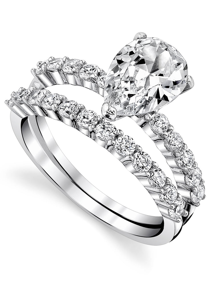 Pop the question with this Sterling Silver Cubic Zirconia 2-piece Bridal Wedding Ring Set. It features a glittering engagement ring with a 1.5 carat prong-set, pear shape, white cubic zirconia center stone and small, round-cut, white cubic zirconia gracefully highlighting the shank. A matching wedding band embellished round-cut, white cubic zirconia is included to complete this set. This sterling silver set is enhanced with high polish finish.
