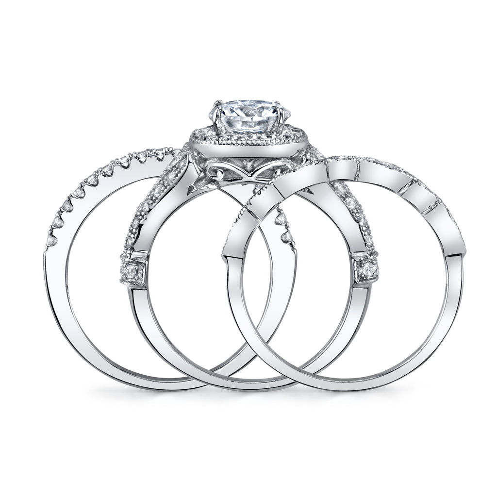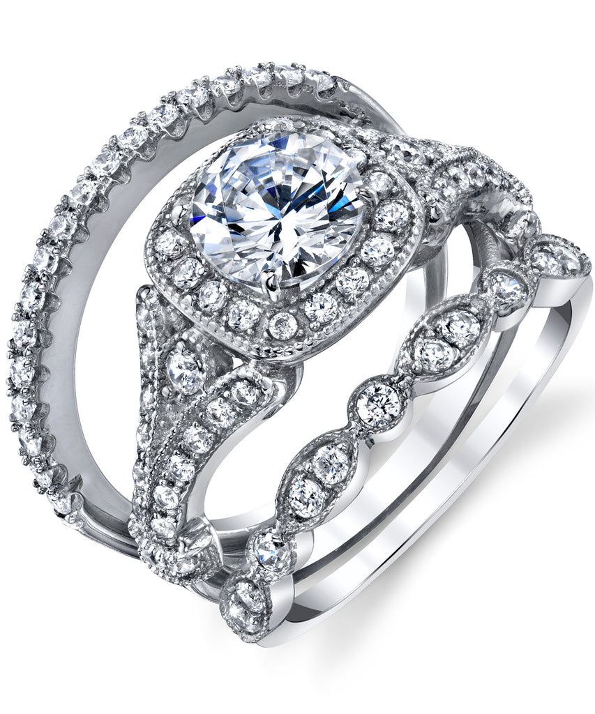 This extravagant bridal set displays a beautiful 1 carat round cut cubic zirconia set in the middle of a sparkling CZ halo. The engagement ring is complimented by 2 addition bands to complete the 3 peice set. One of the bands has a half eternity round cubic zirconia setting while the other has marquise shape designs on the band with round cut cubic zirconia. These rings are handcrafted in high polished 925 sterling silver and is rhodium plated to give it the perfect white gold look. The matching wedding band is included in your purchase.